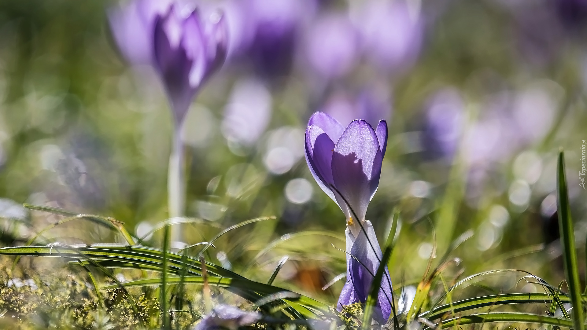 Edytor tapety: Rozświetlone fioletowe krokusy na rozmytym tle