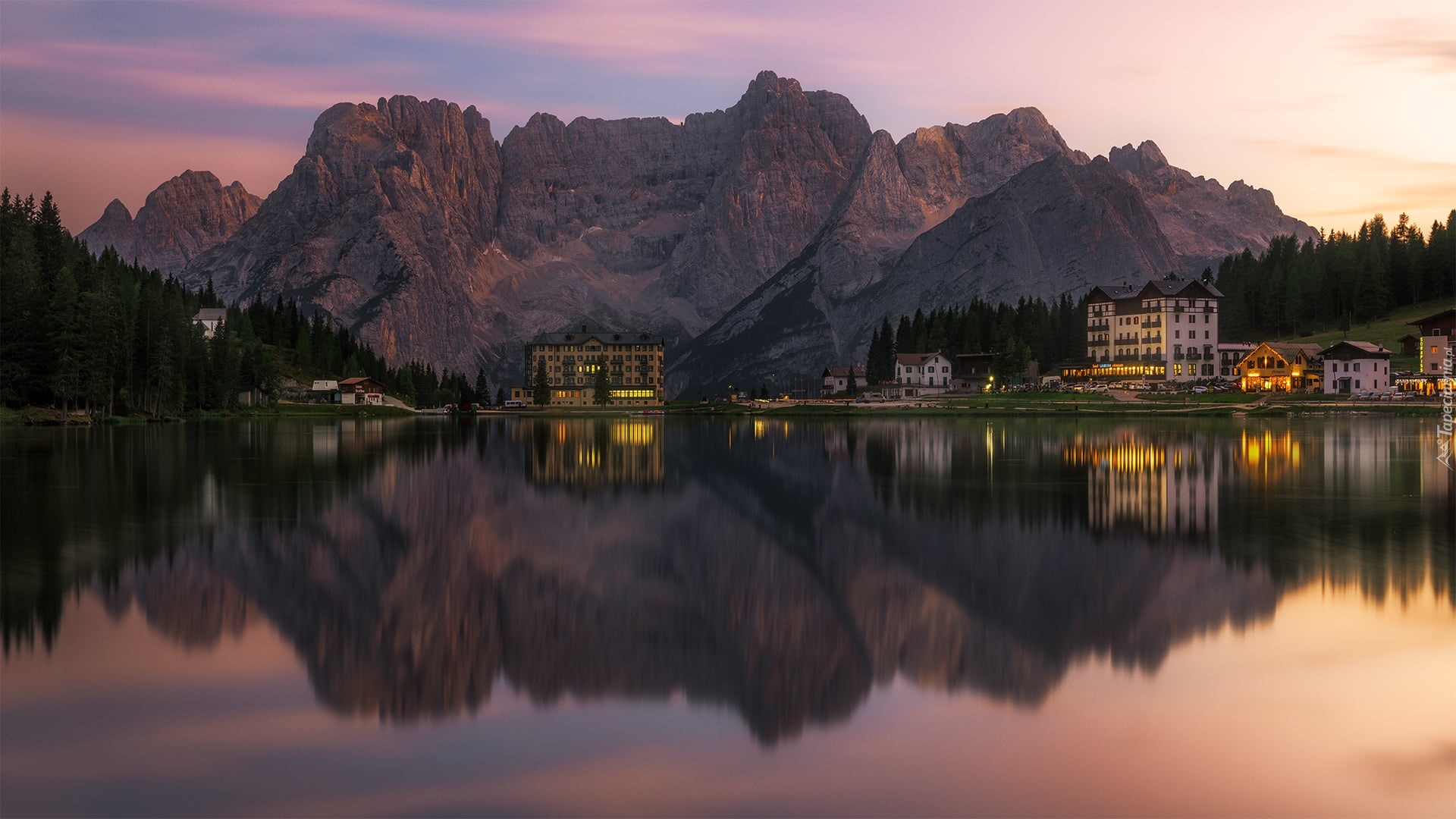Edytor tapety: Domy nad jeziorem Misurina Lake w Dolomitach