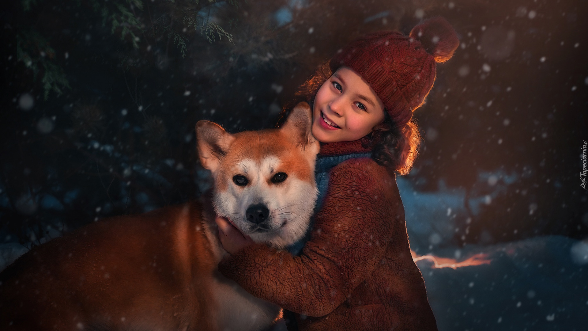 Edytor tapety: Dziewczynka obejmująca psa rasy shiba inu