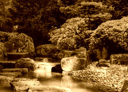 Edytor tapety: Drzewa i kamienie nad strumieniem w ogrodzie japońskim