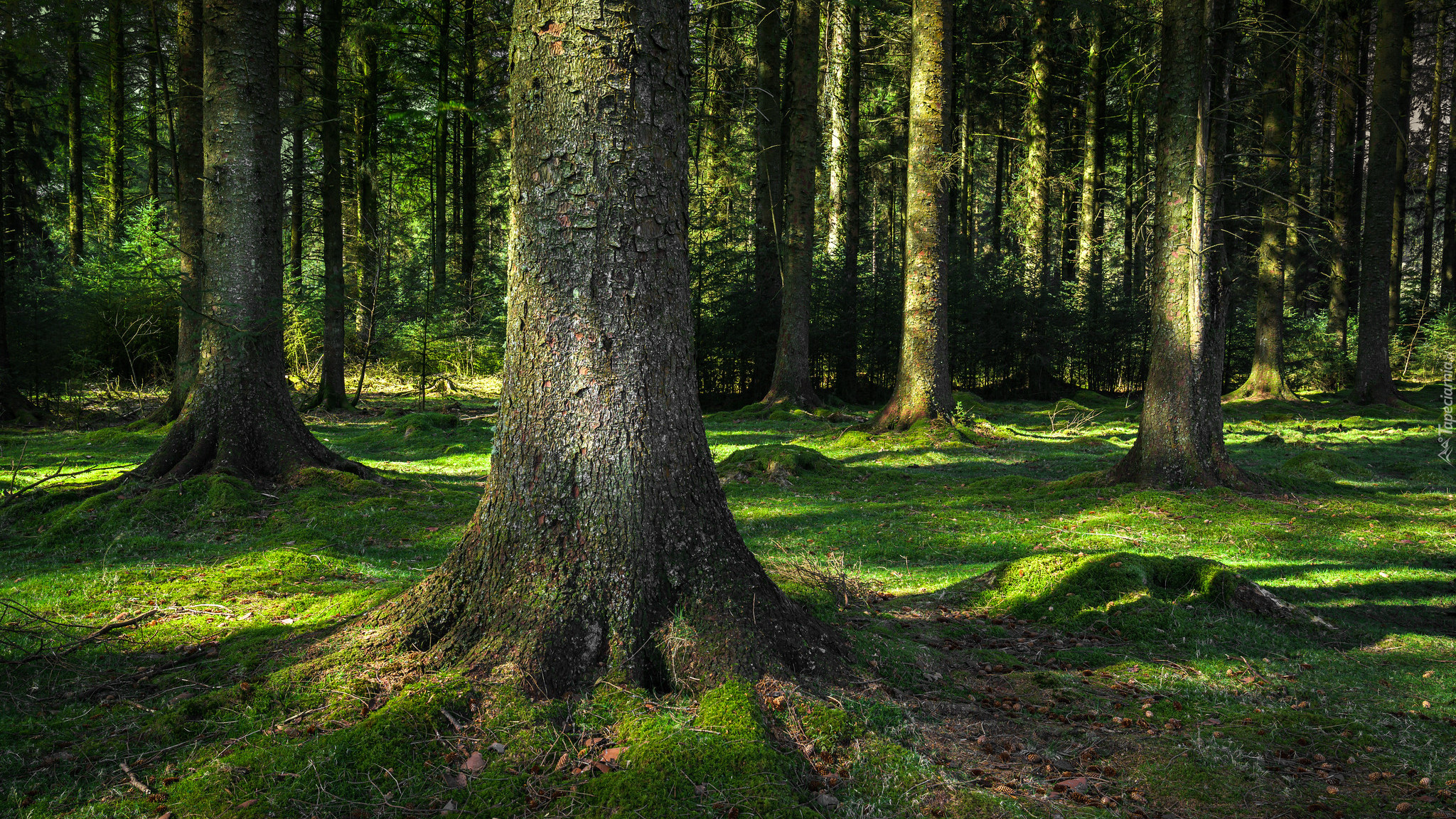 Edytor tapety: Porastający ściółkę mech pod drzewami w lesie
