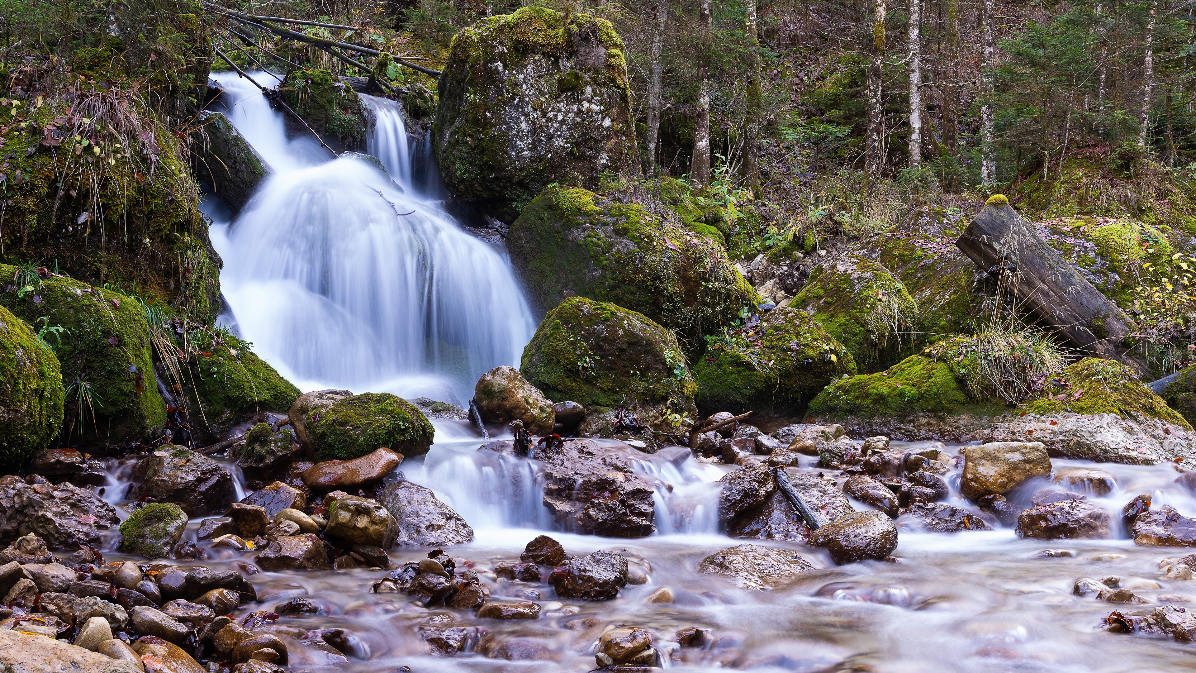 Edytor tapety: Omszałe głazy przy wodospadzie wpadającym do rzeki
