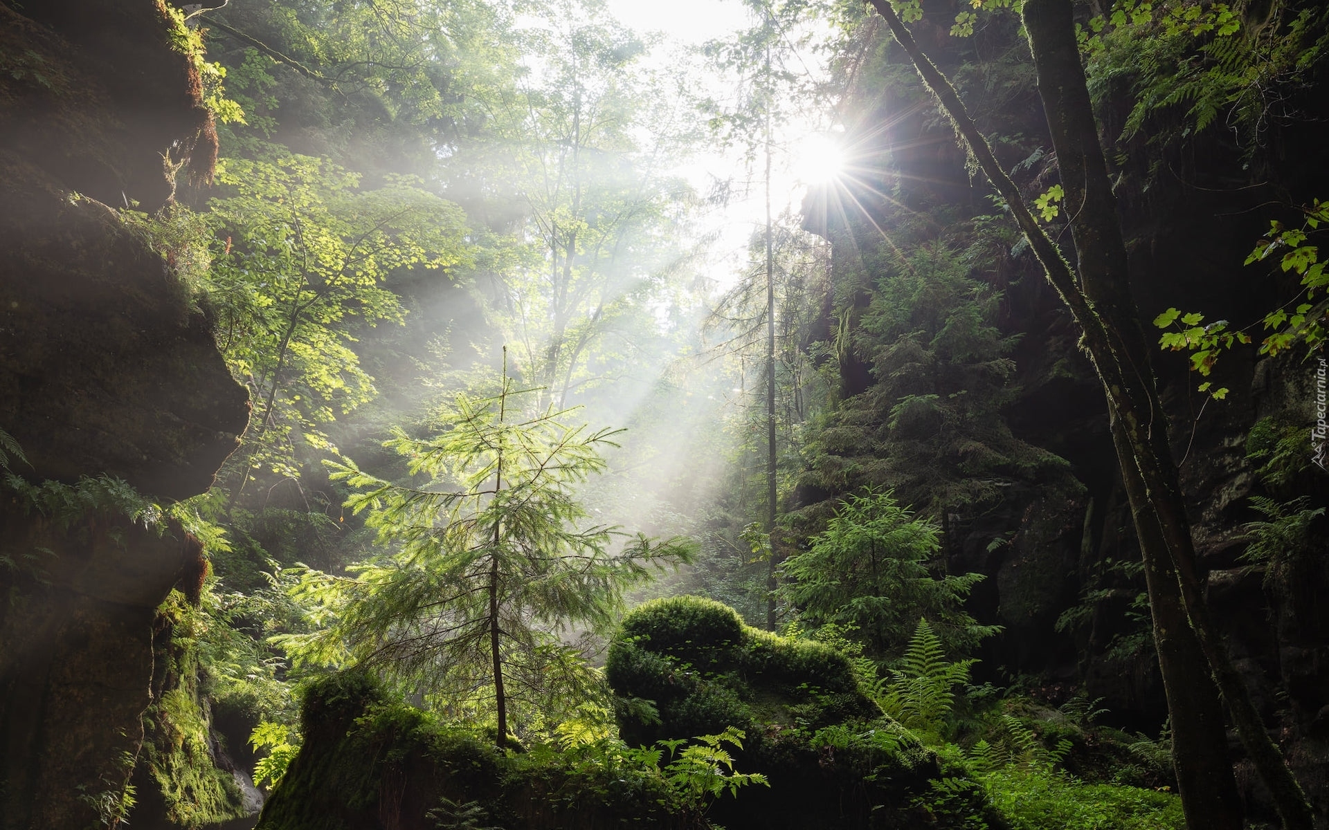 Edytor tapety: Omszałe skały i las w promieniach słońca
