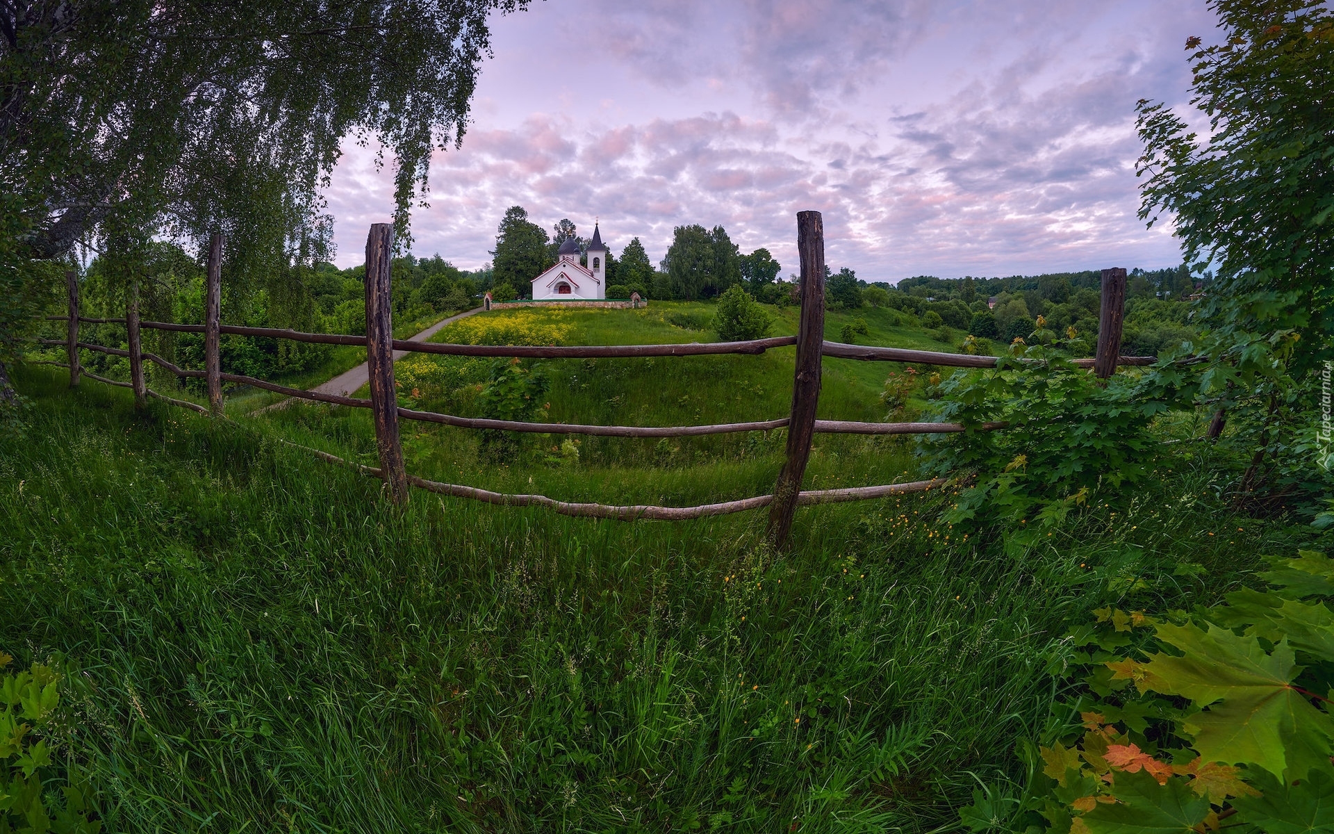Edytor tapety: Drewniany płot i kościółek na wzgórzu