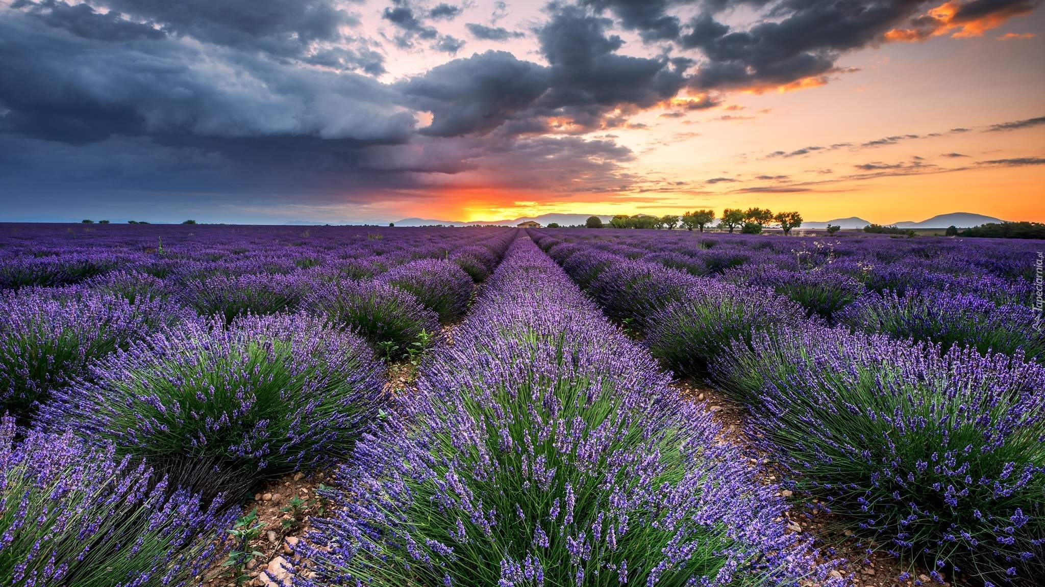 Edytor tapety: Ciemne chmury nad polem lawendy