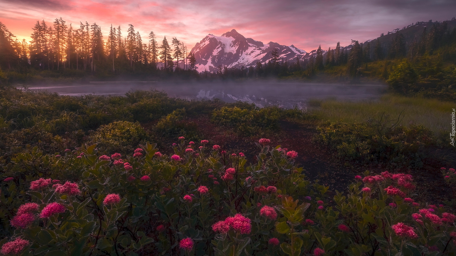 Edytor tapety: Kwiaty nad zamglonym stawem na tle gór