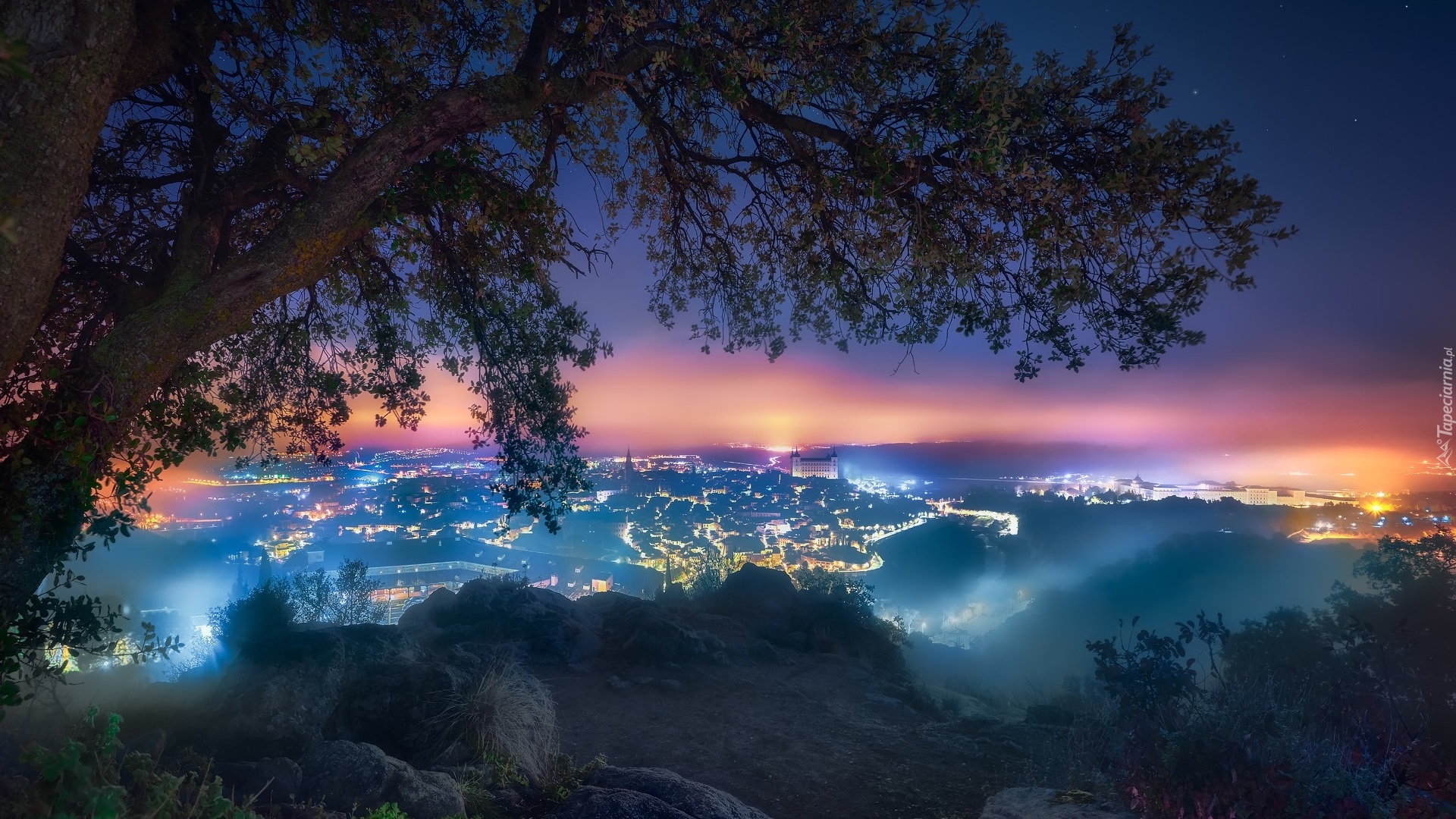 Edytor tapety: Drzewo na wzgórzu i widok na oświetlone miasto