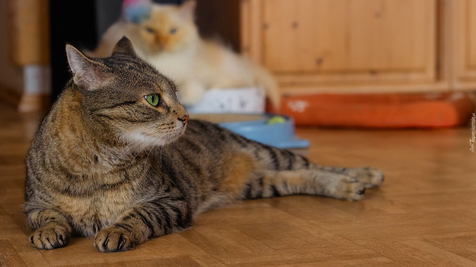 Edytor tapety: Kot leżący na parkiecie
