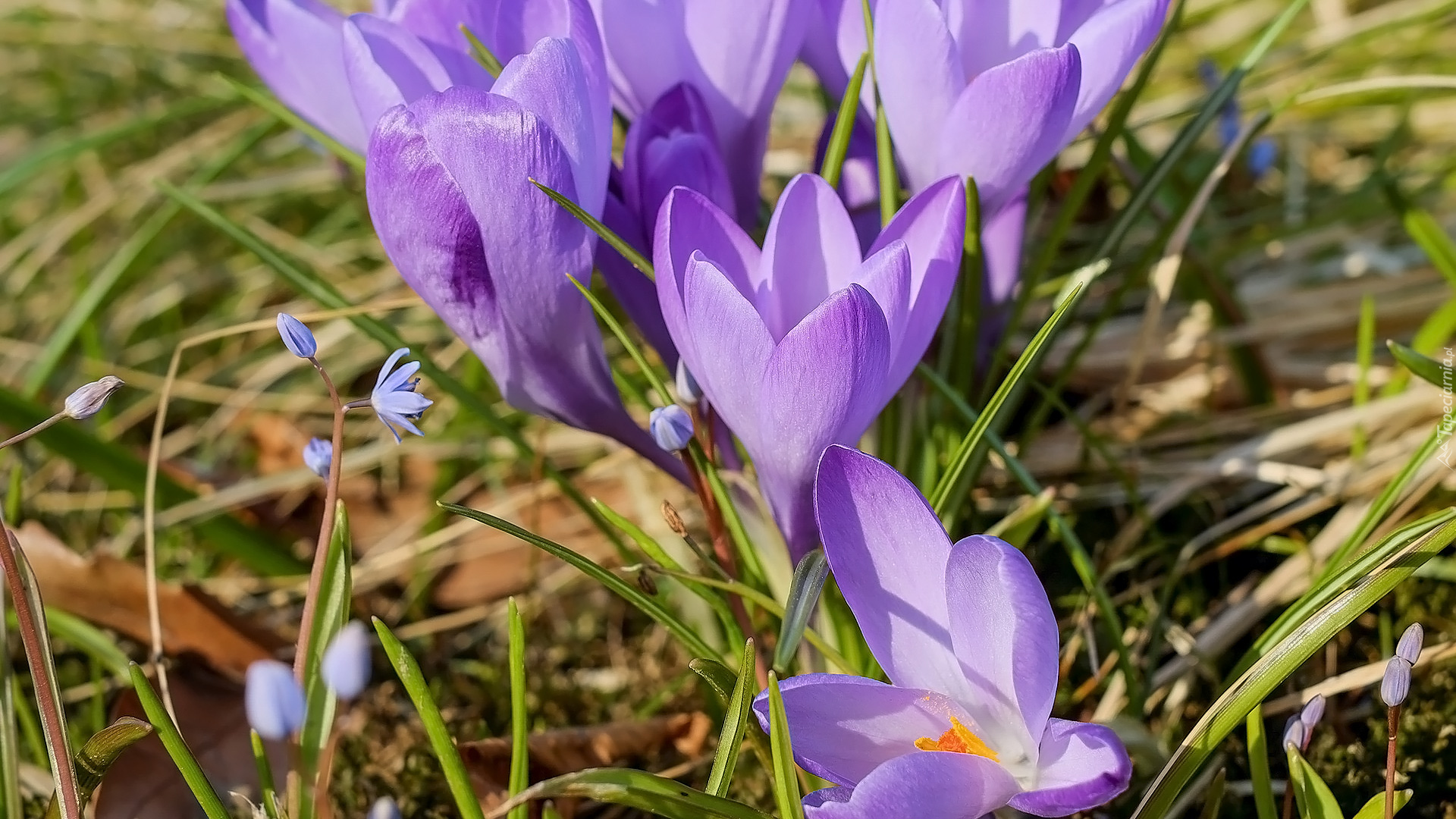 Edytor tapety: Fioletowe rozkwitające krokusy w słonecznym blasku