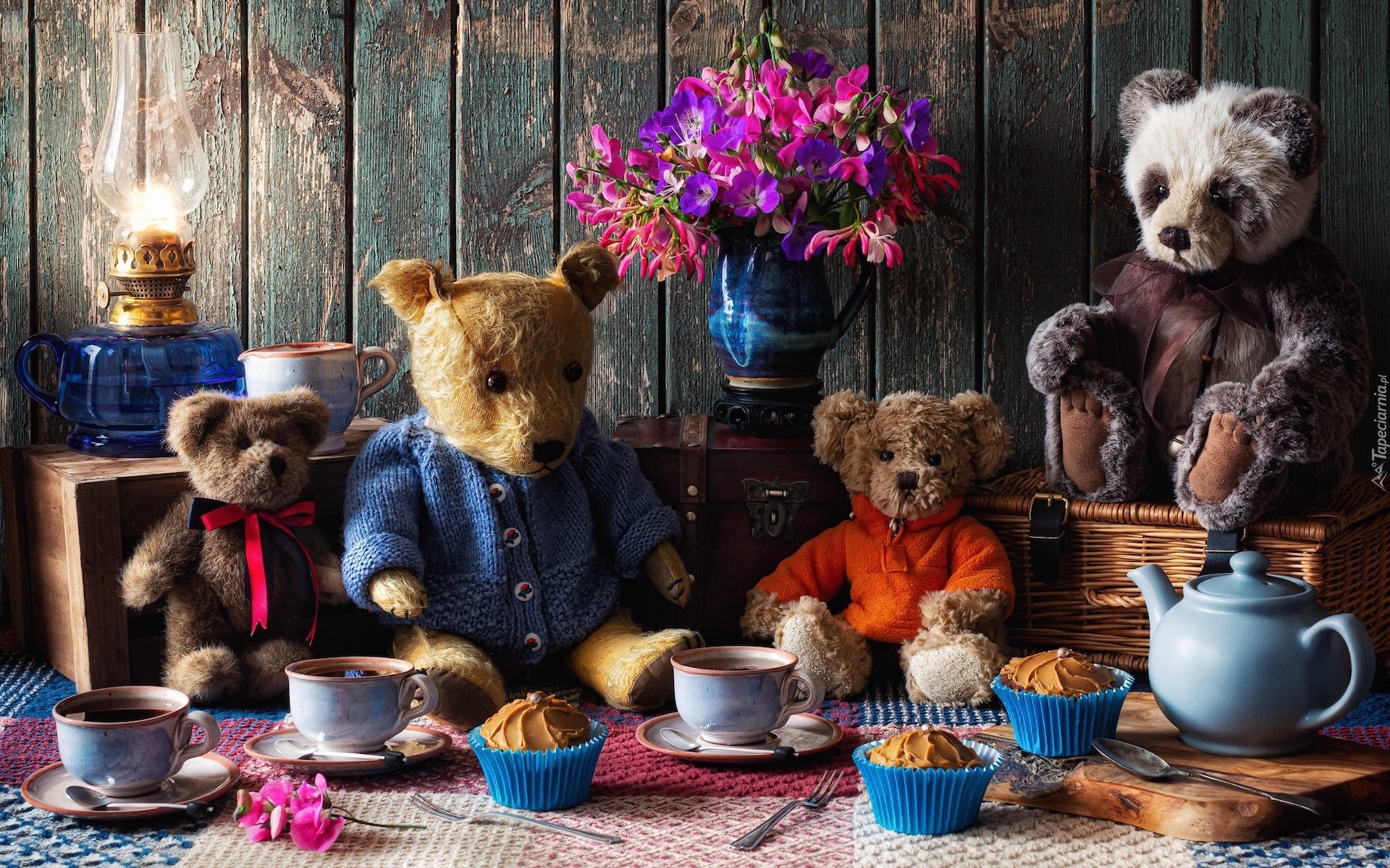 Edytor tapety: Pluszowe misie obok babeczek i kawy