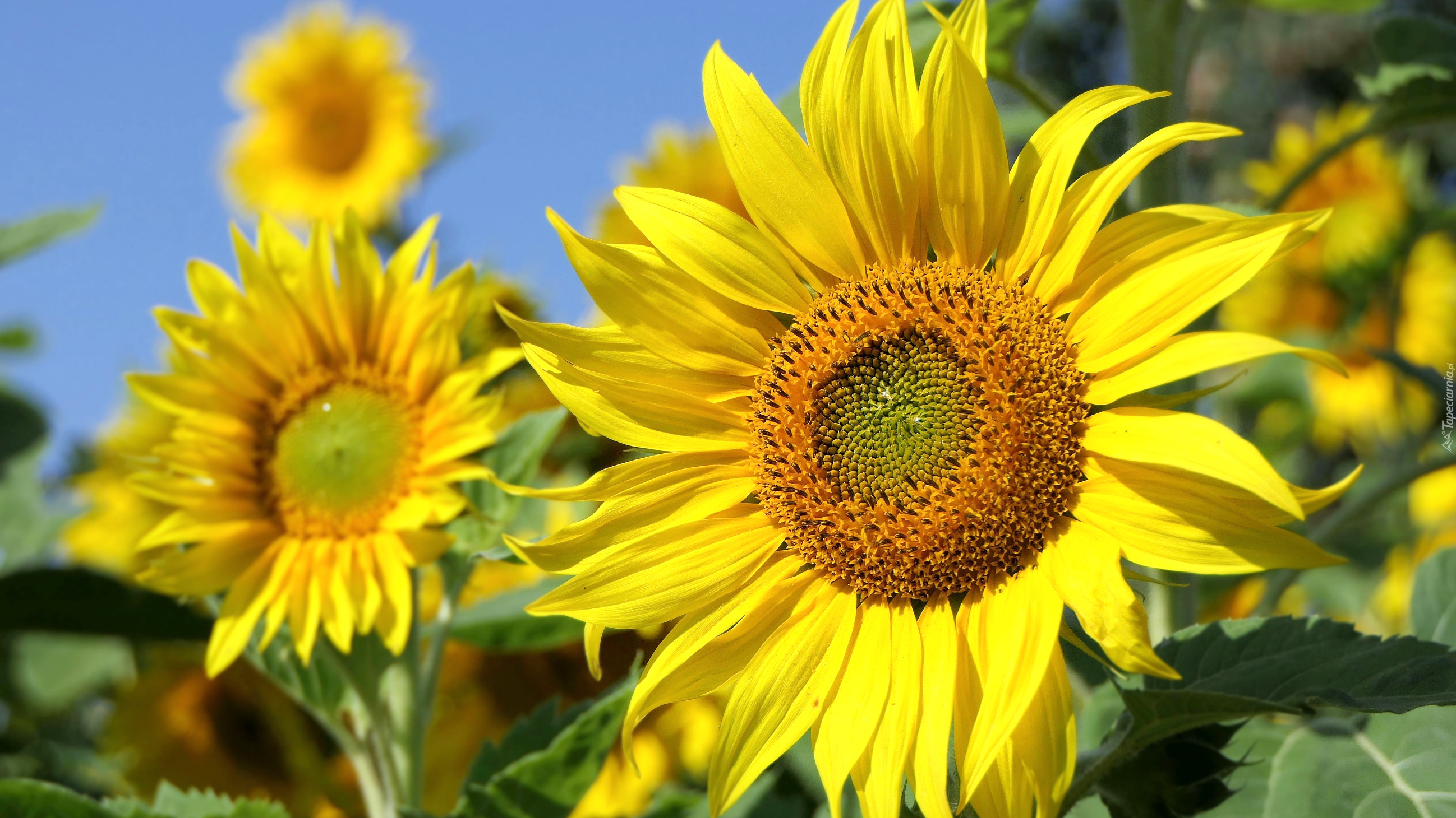 Edytor tapety: Rozświetlone słońcem słoneczniki na polu