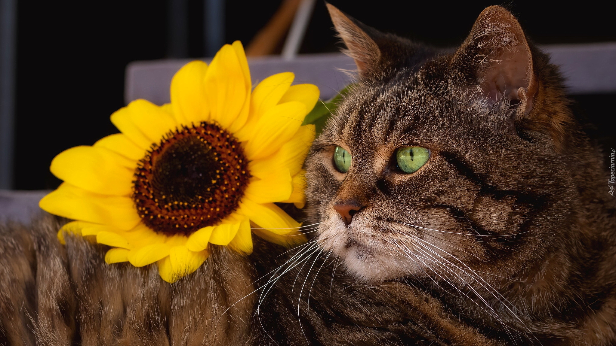 Edytor tapety: Kwiat słonecznika na burym kocie