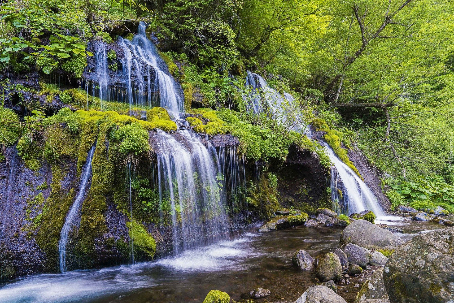 Edytor tapety: Wodospad na omszonej skale w lesie