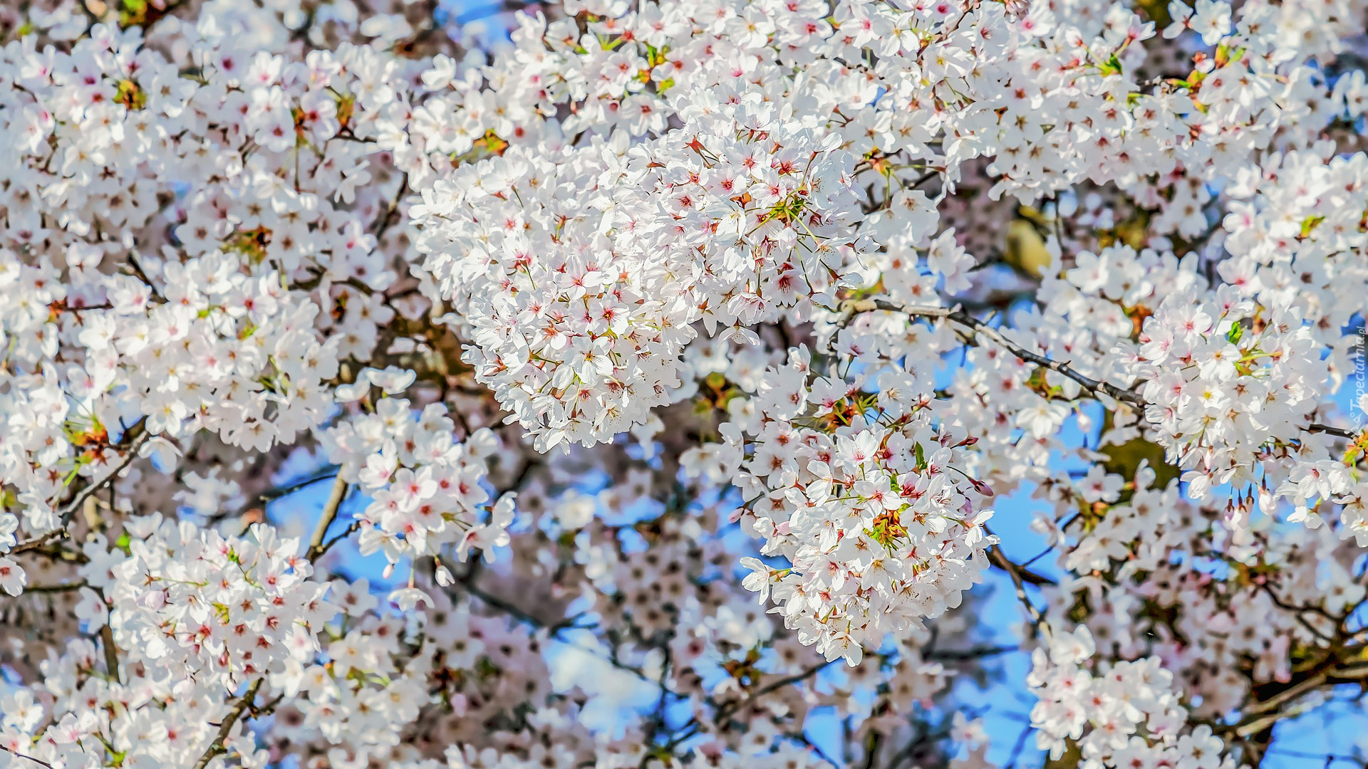 Edytor tapety: Rozświetlone słońcem białe kwiaty drzewa owocowego