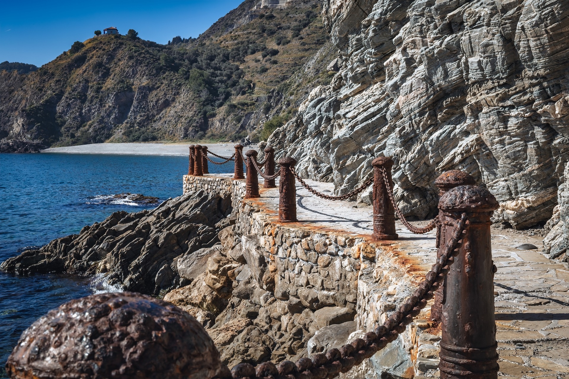 Edytor tapety: Ogrodzona łańcuchami ścieżka pod skałami nad morzem