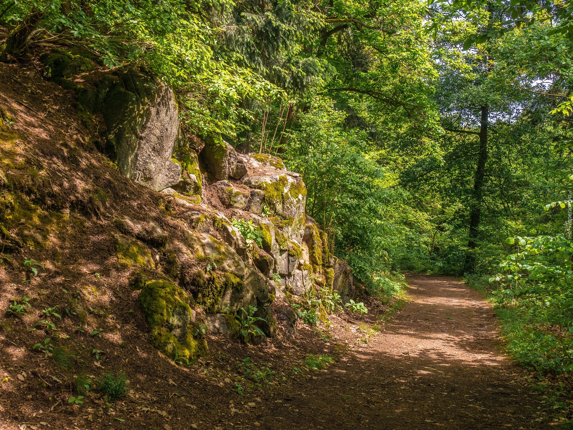 Edytor tapety: Rozświetlone słońcem skały i drzewa przy leśnej drodze