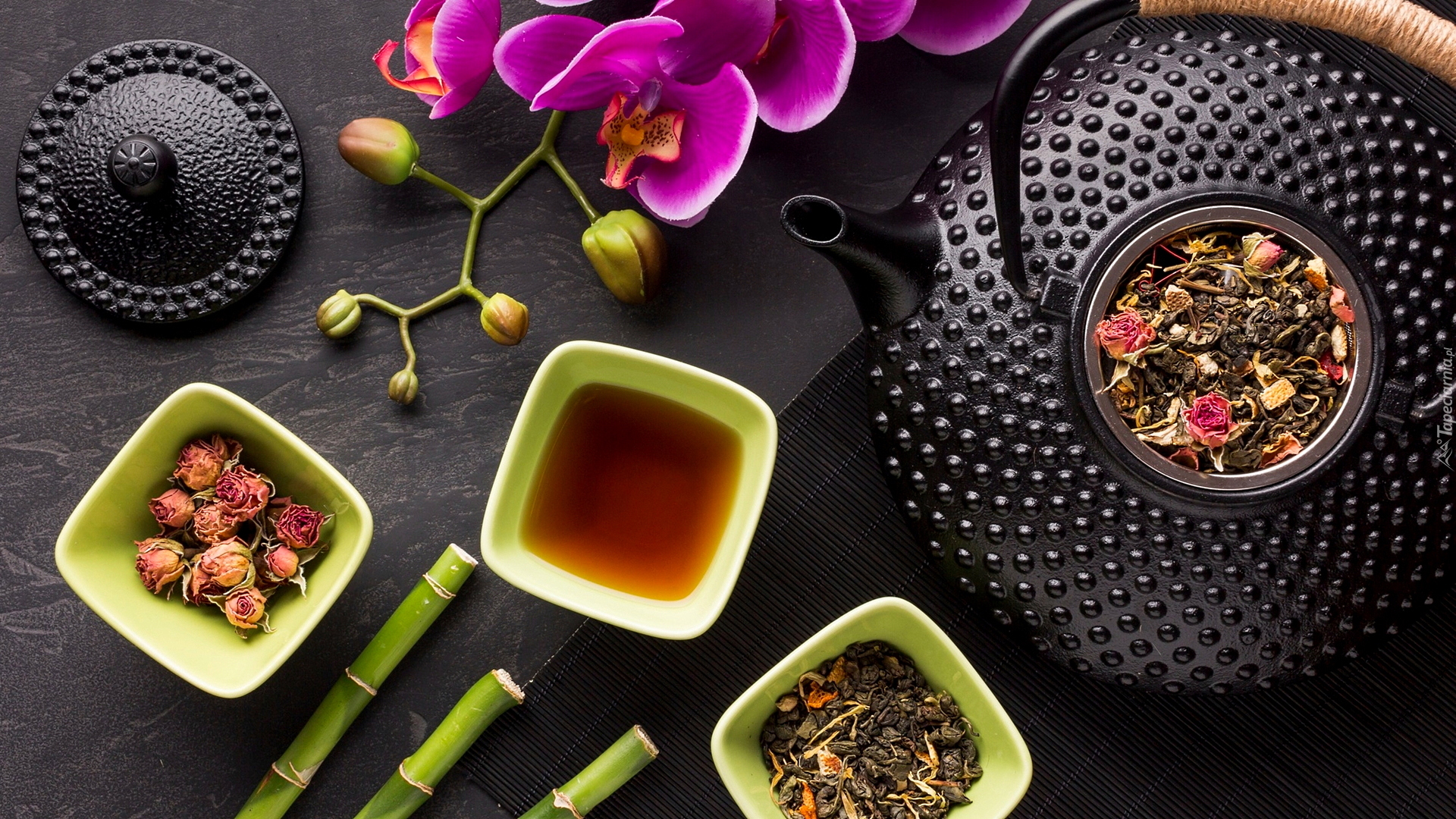 Edytor tapety: Storczyk i miseczki z suchymi kwiatami obok czajnika