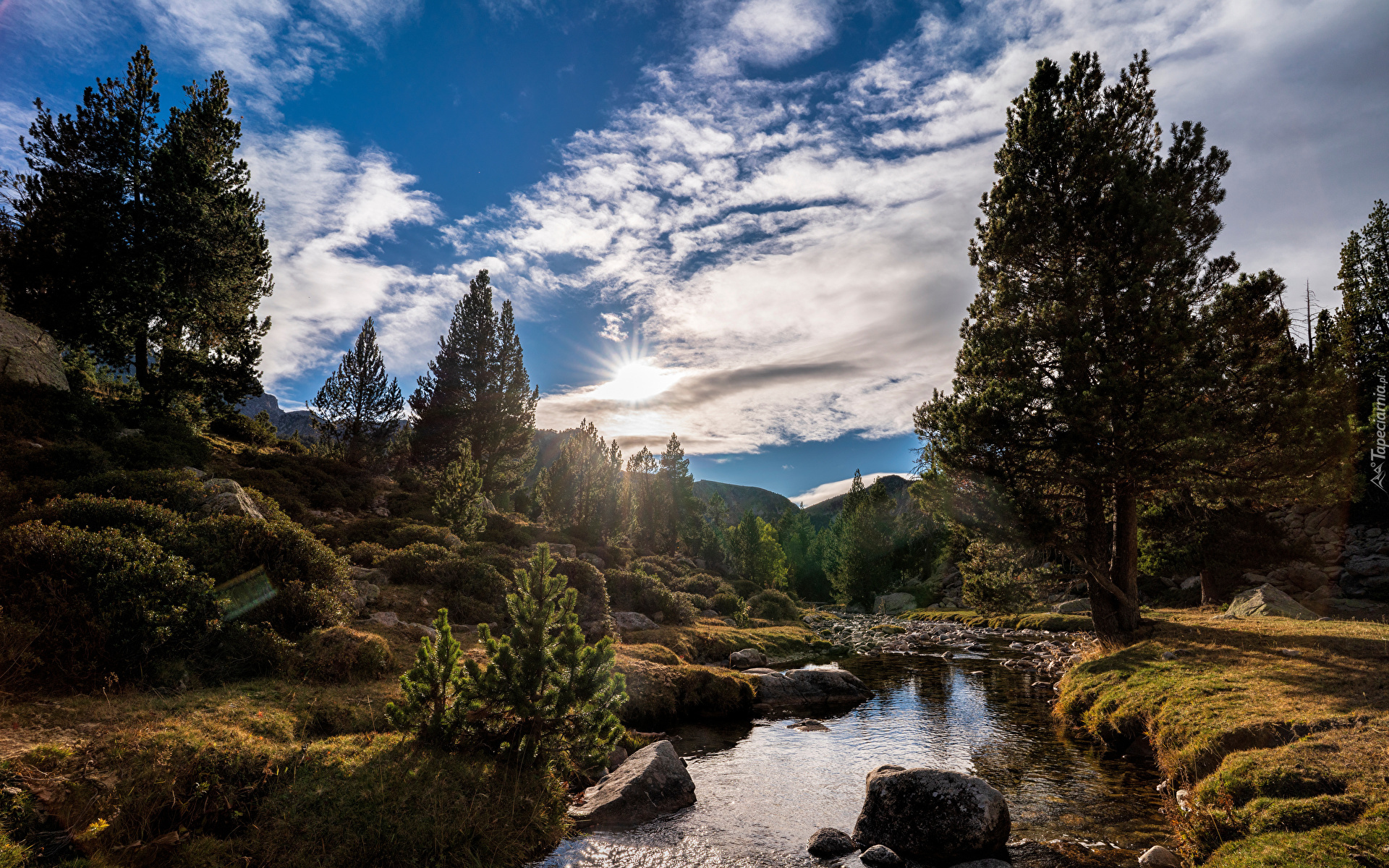 Edytor tapety: Drzewa przy kamienistej rzece w promieniach słońca