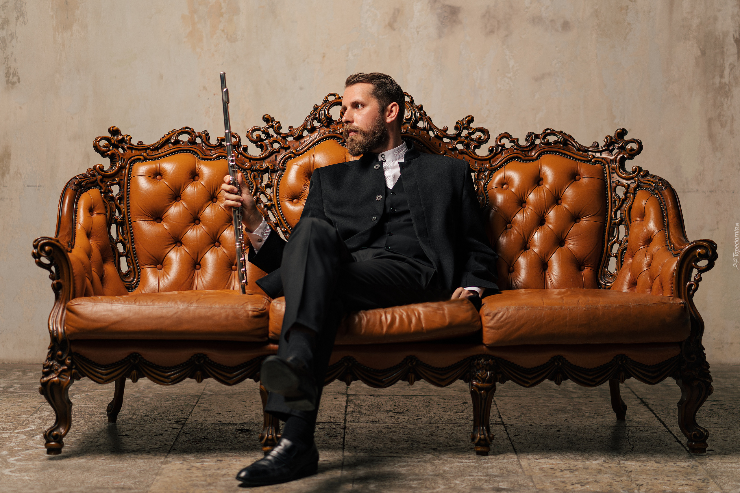 Edytor tapety: Mężczyzna z fletem na sofie