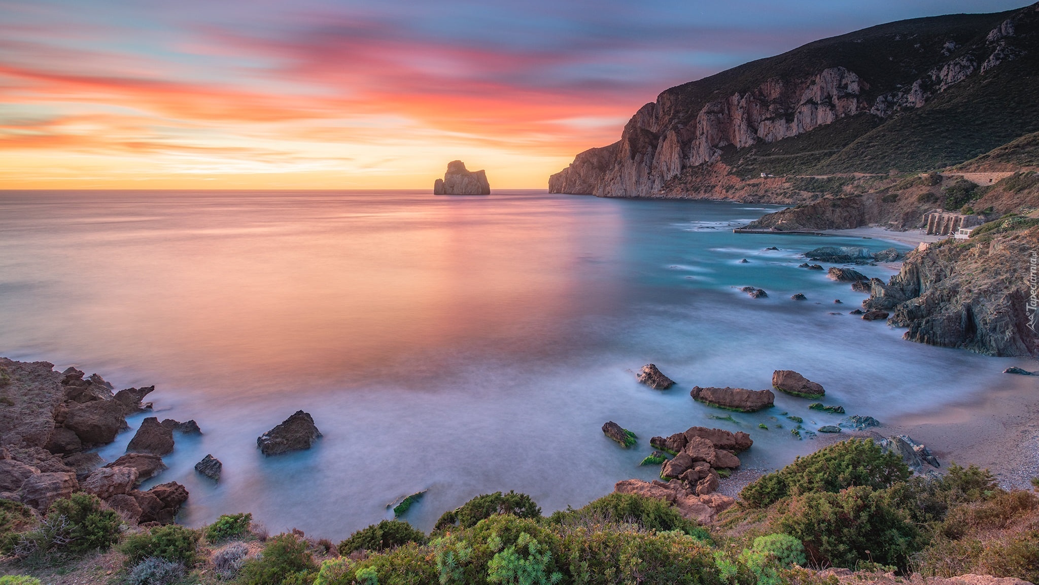 Edytor tapety: Skały na morskim brzegu o zachodzie słońca