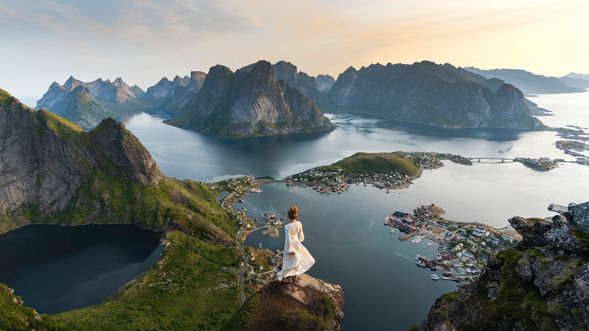 Edytor tapety: Kobieta na szczycie góry spoglądająca na Lofoty