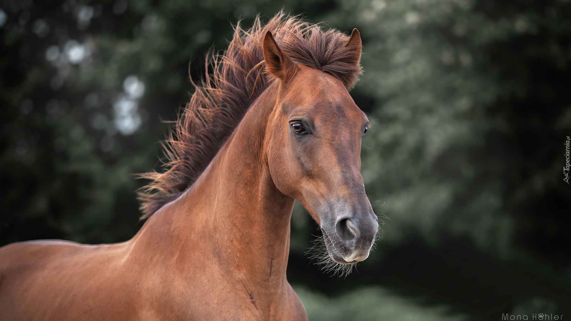Edytor tapety: Koń o maści kasztanowatej z rozwianą grzywą