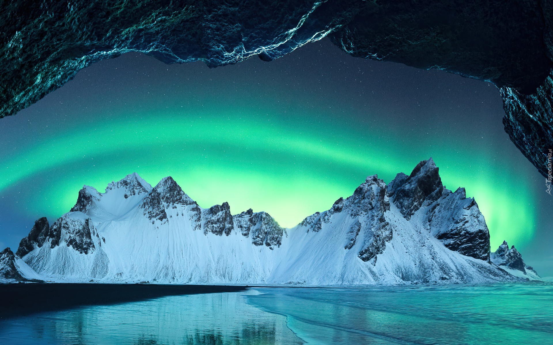 Edytor tapety: Zorza polarna nad ośnieżonymi górami nad morzem