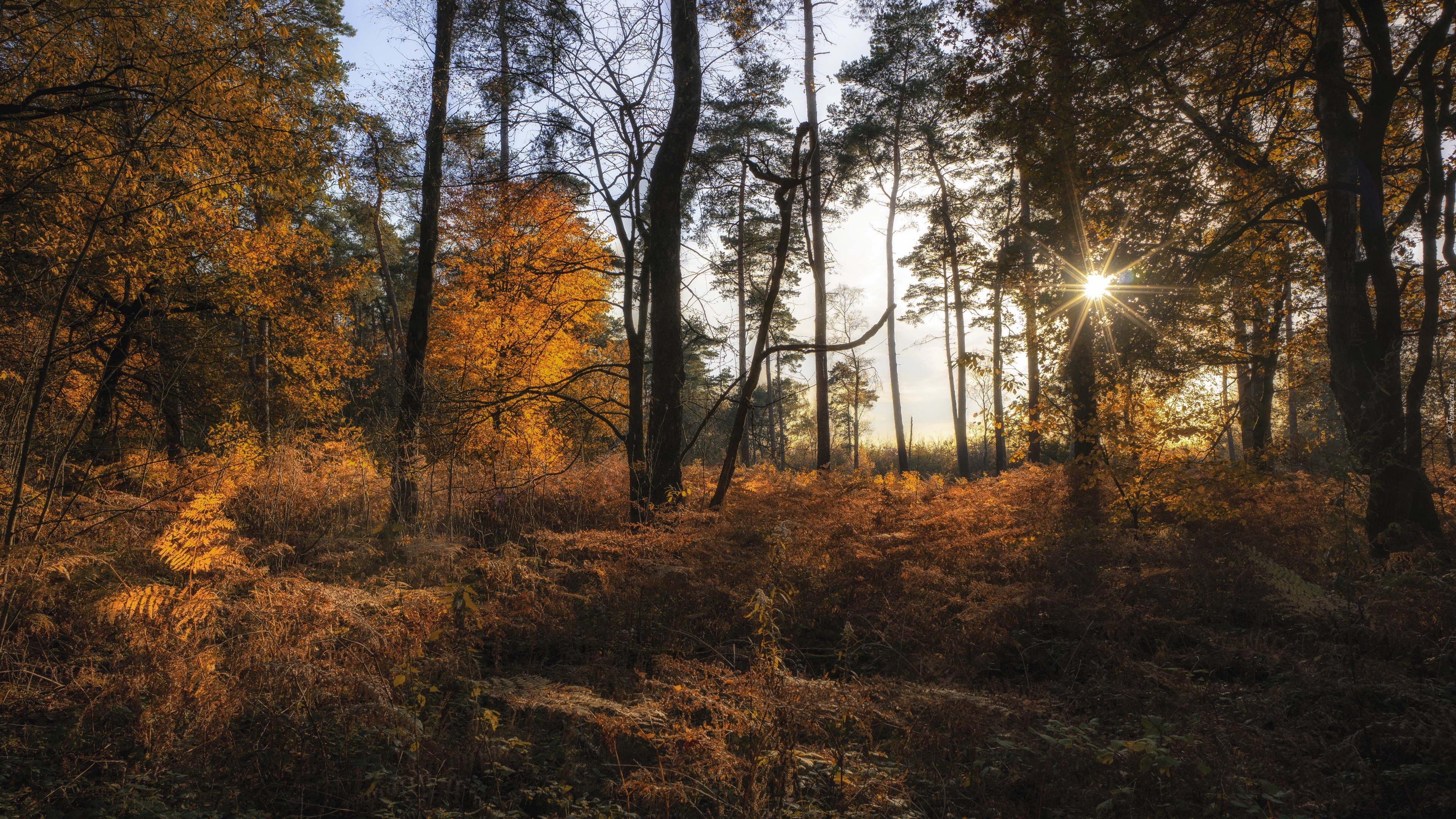 Edytor tapety: Promienie słońca wśród drzew w jesiennym lesie