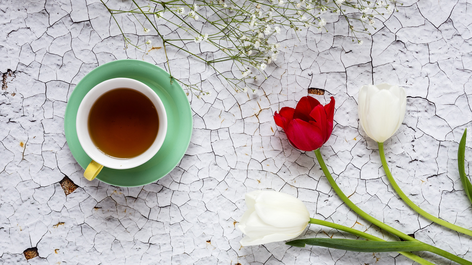 Edytor tapety: Tulipany i gipsówka obok filiżanki herbaty