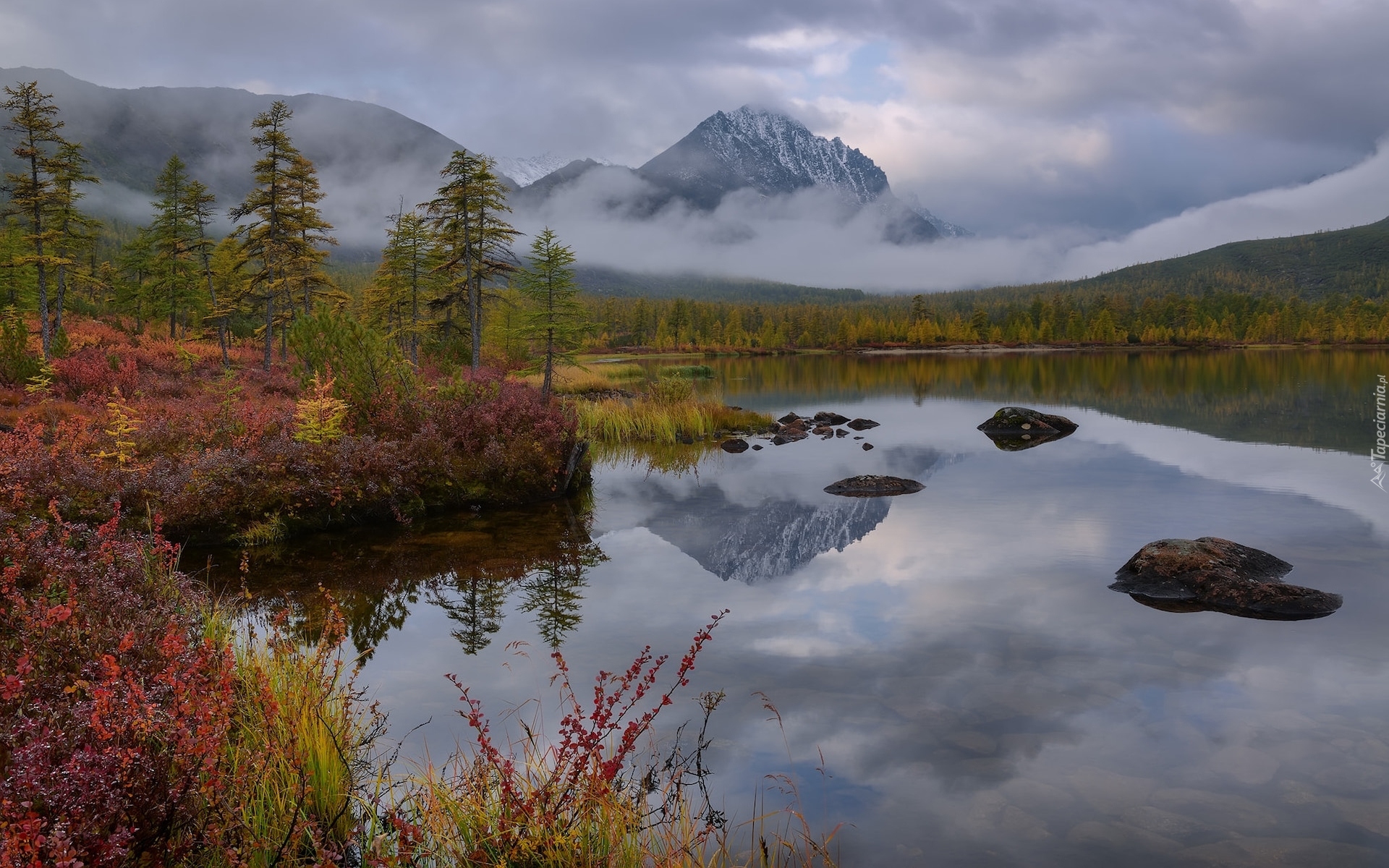 Edytor tapety: Widok znad Jeziora Nevidimka na zamglone góry