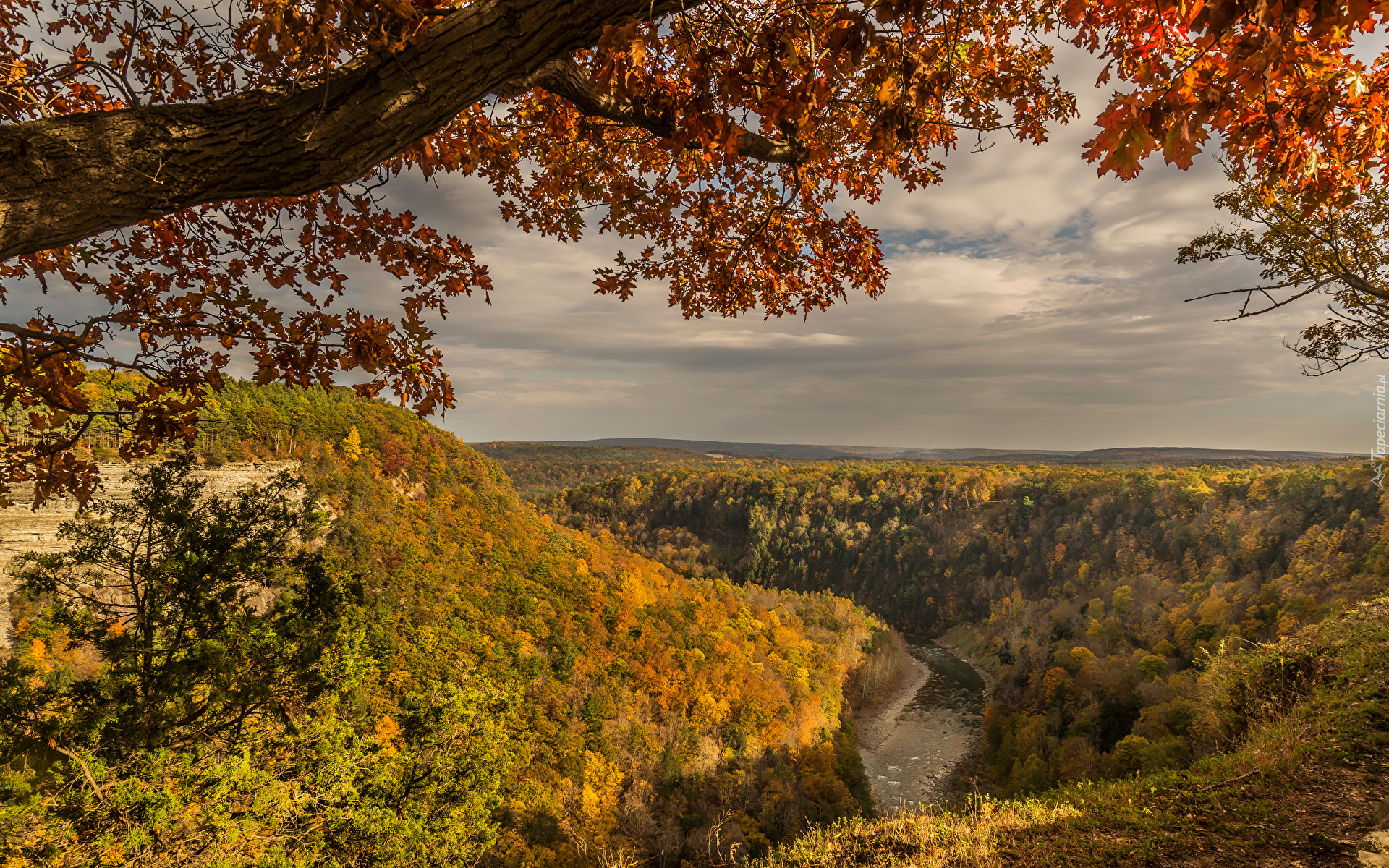 Edytor tapety: Widok spod gałęzi drzewa na rzekę w dolinie