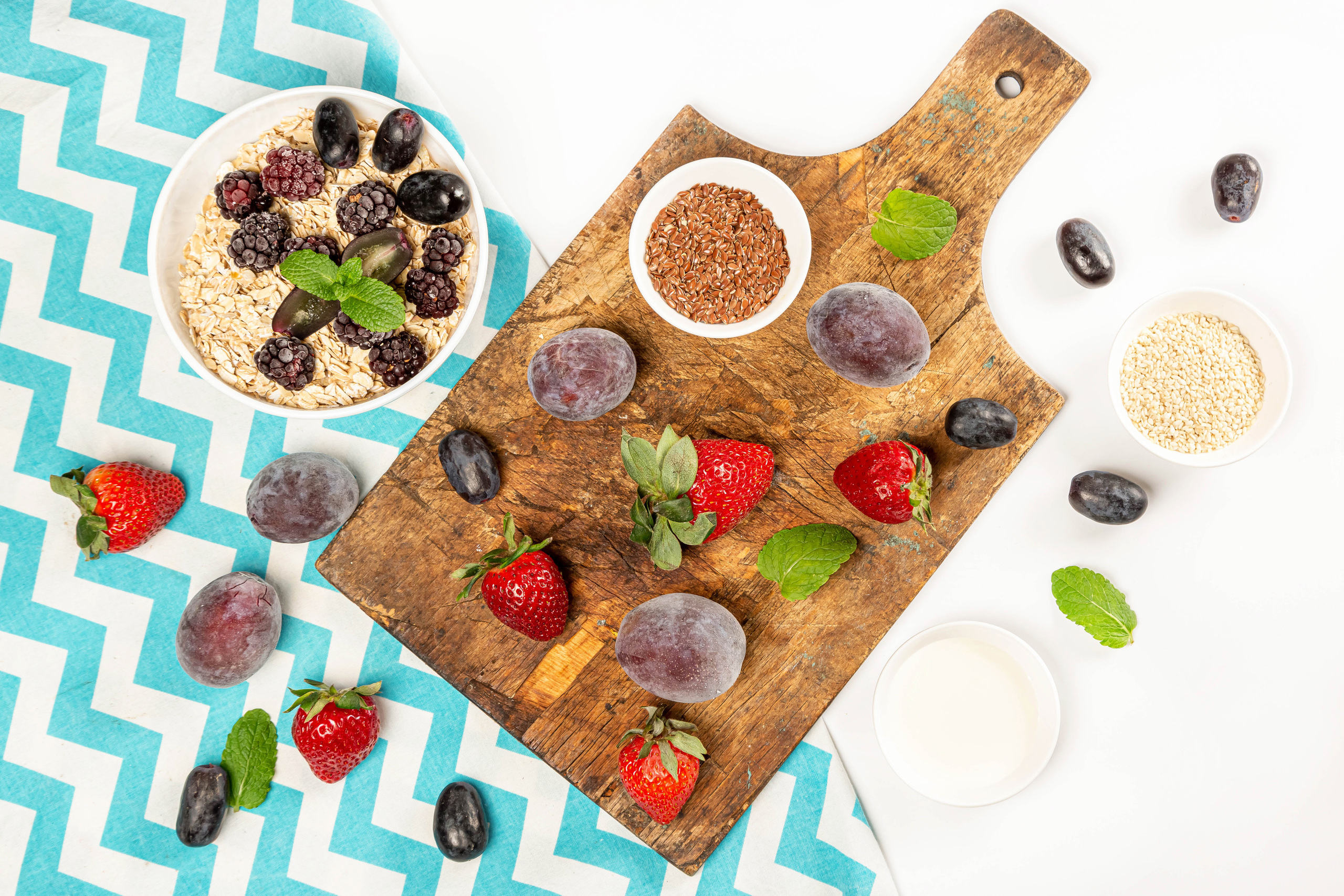 Edytor tapety: Owoce na desce obok miseczki z musli