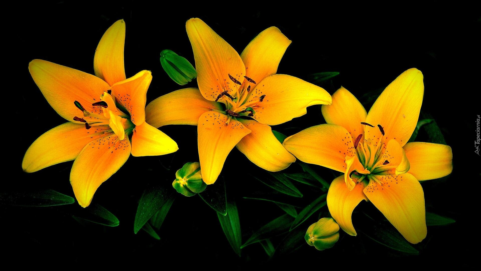 Edytor tapety: Trzy żółte lilie na ciemnym tle