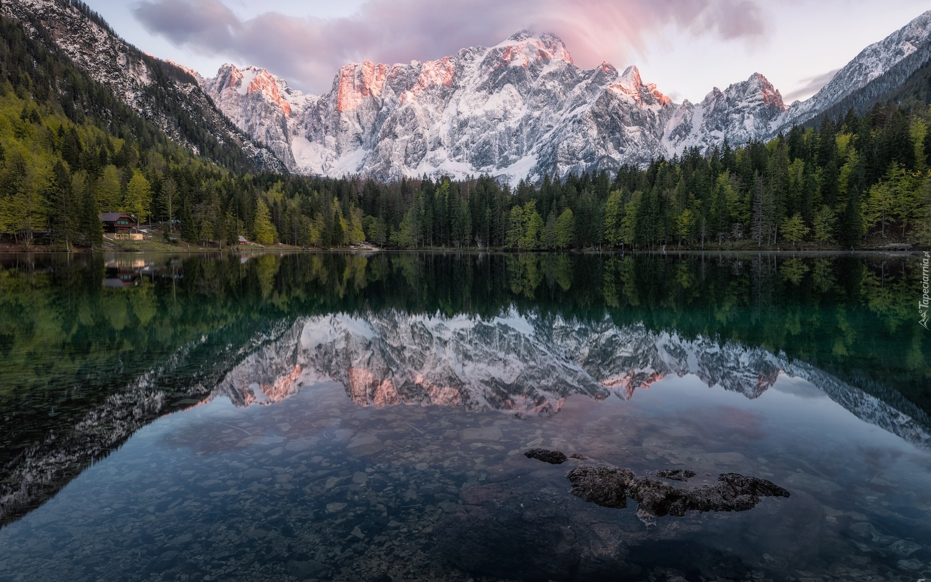 Edytor tapety: Odbicie lasów i ośnieżonych gór w jeziorze