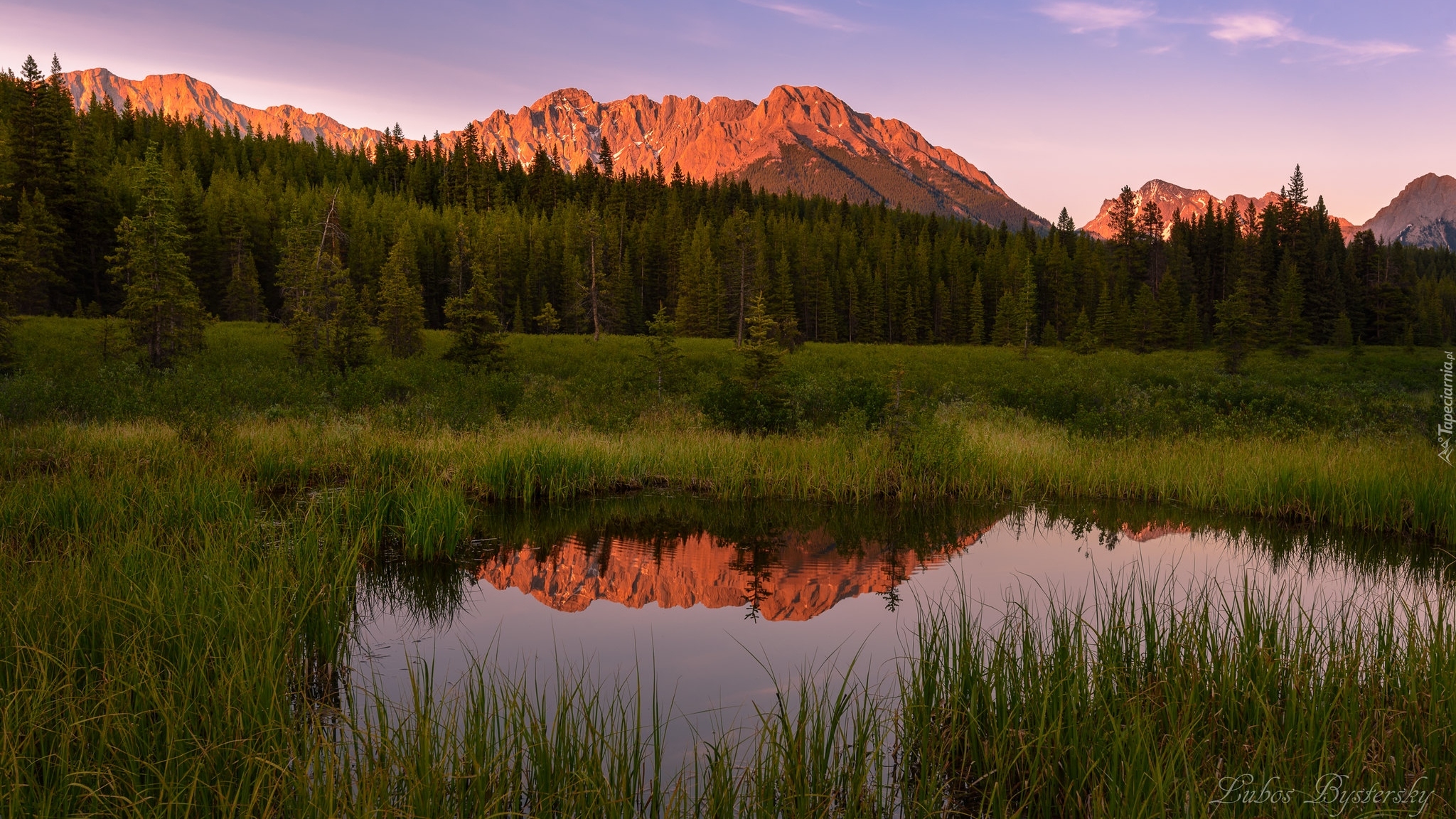 Edytor tapety: Widok znad stawu na rozświetlone szczyty