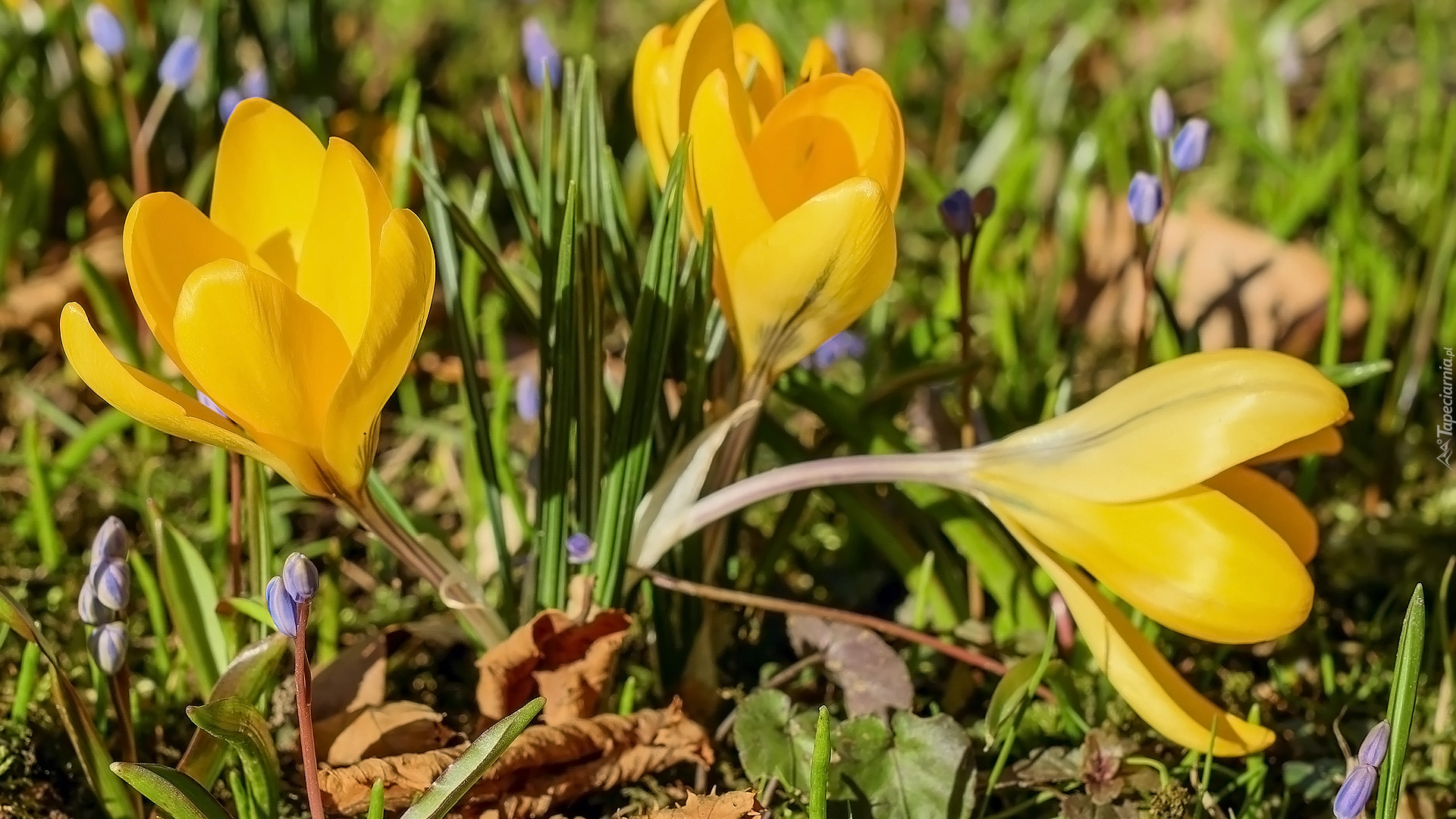 Edytor tapety: Trzy żółte krokusy w trawie