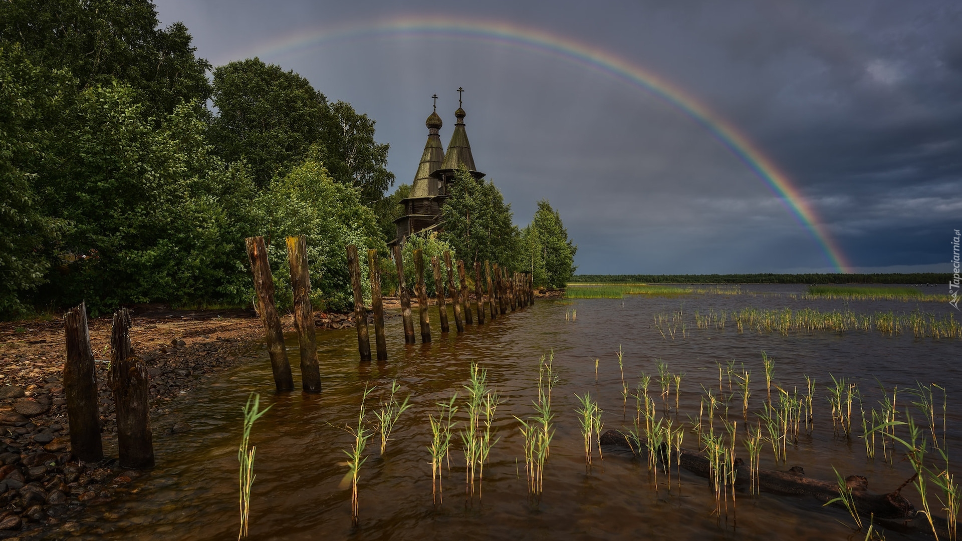 Edytor tapety: Tęcza nad jeziorem i cerkwią