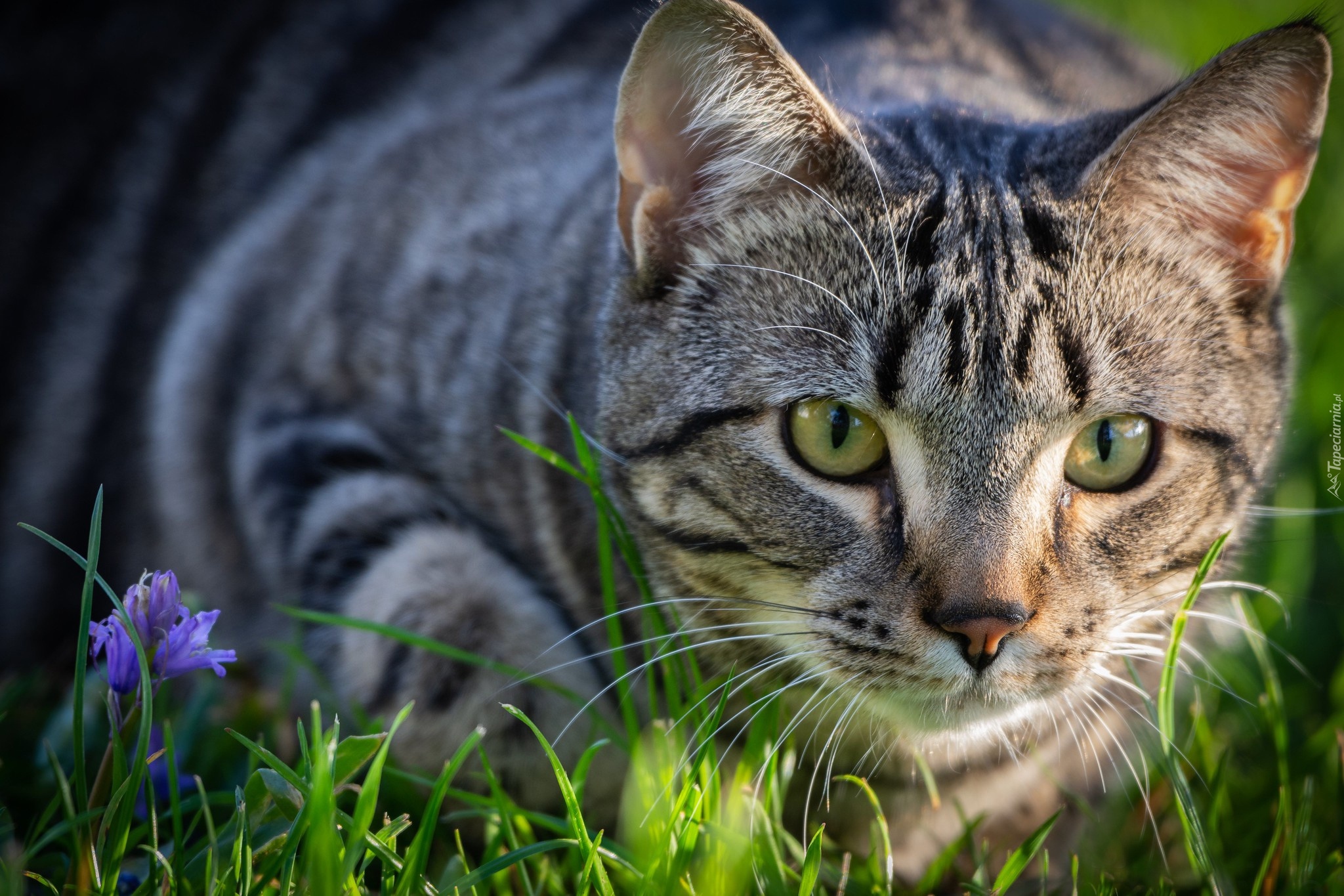 Edytor tapety: Bury zielonooki kot leżący w trawie