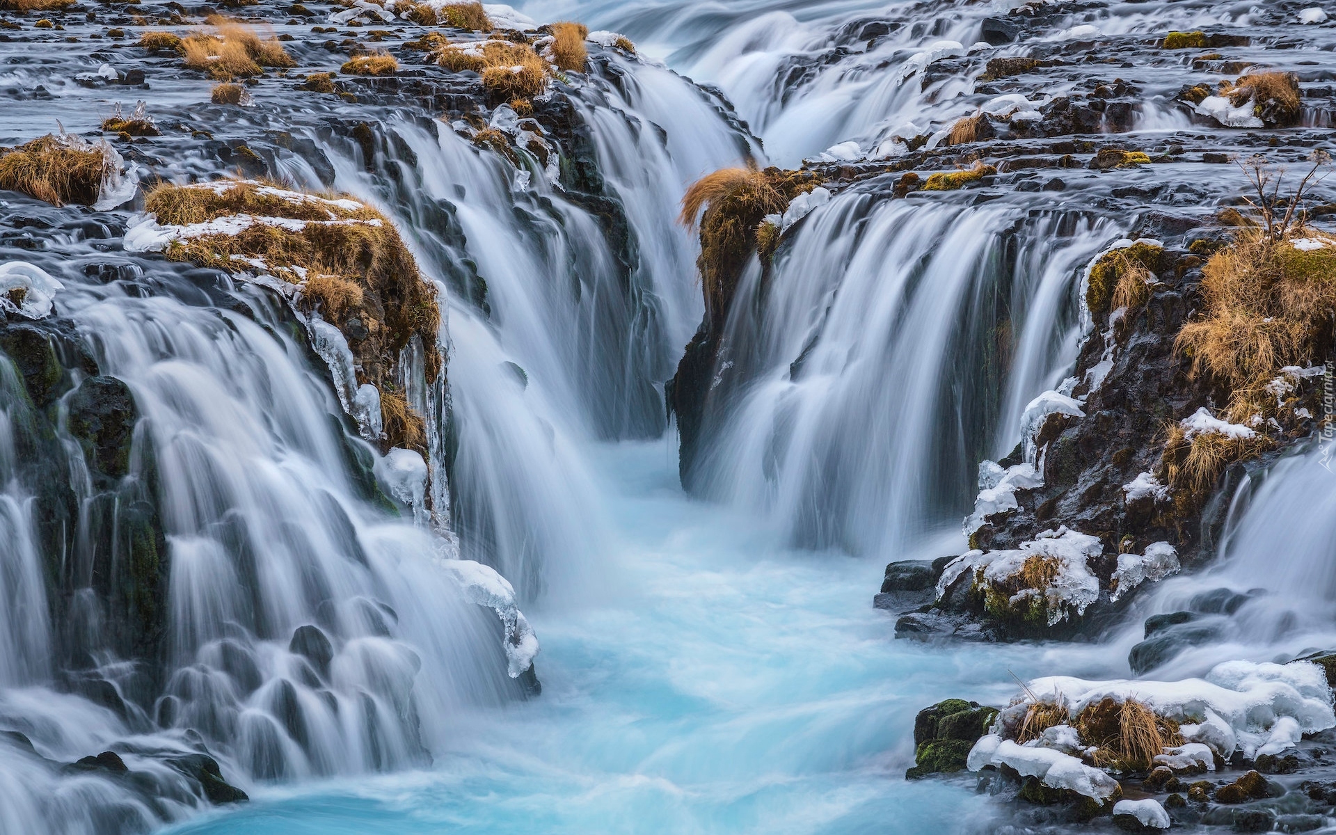 Edytor tapety: Wodospad Bruarfoss na ośnieżonych skałach