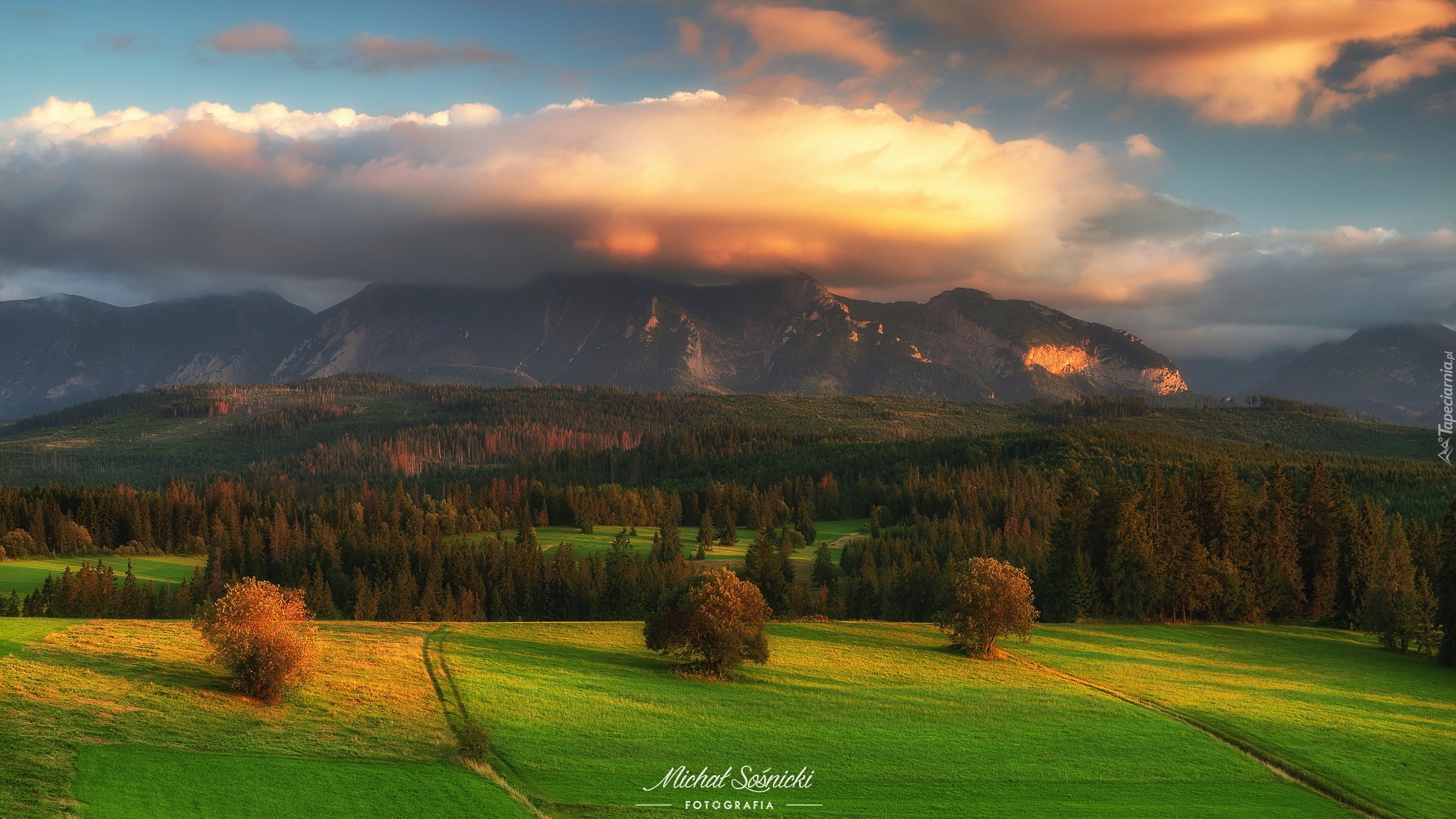 Edytor tapety: Drzewa na polu i góry we wsi Łapszanka