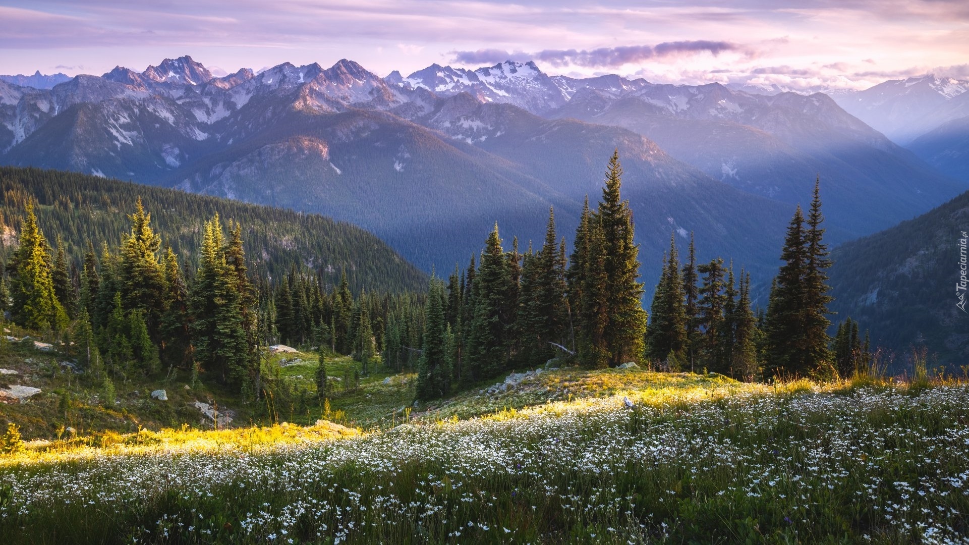 Edytor tapety: Rozświetlone kwiaty i drzewa na tle gór
