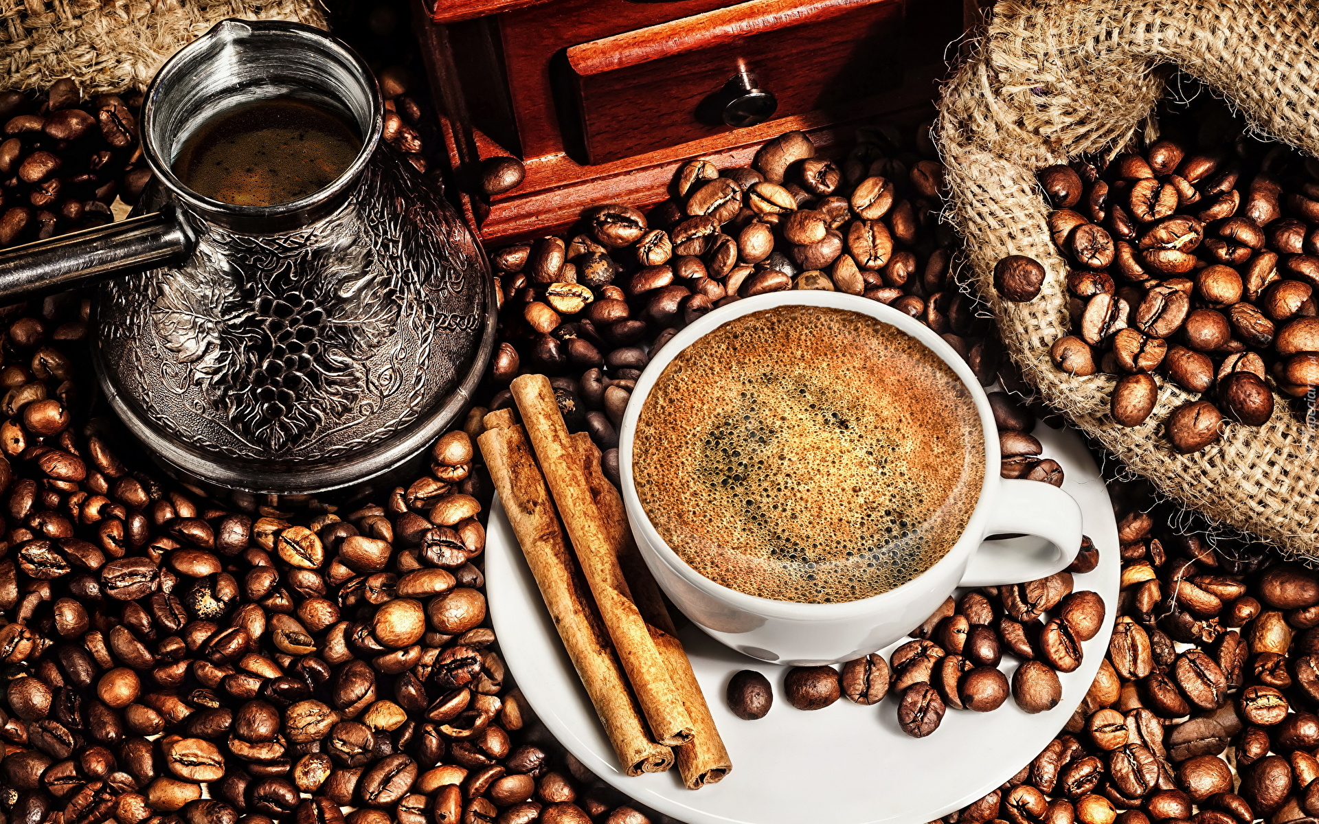 Edytor tapety: Filiżanka kawy i tygielek na ziarnach