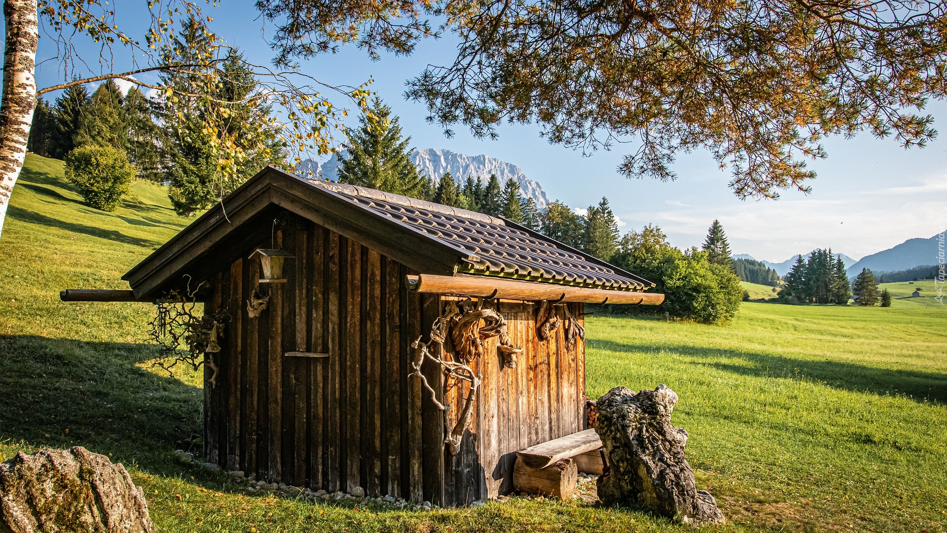 Edytor tapety: Drewniany domek pod drzewem na górskiej łące