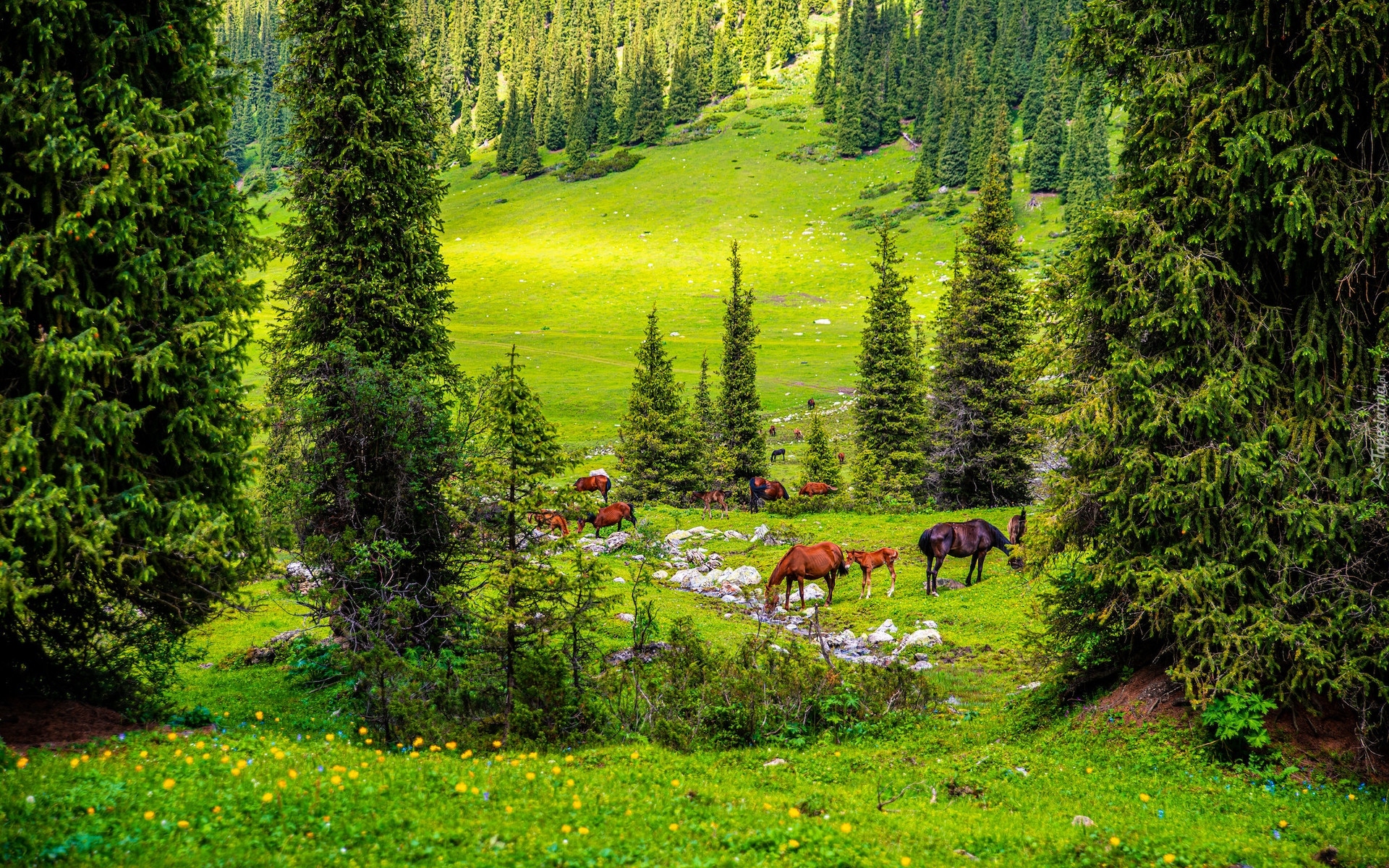 Edytor tapety: Pasące się konie w dolinie Altyn Arashan