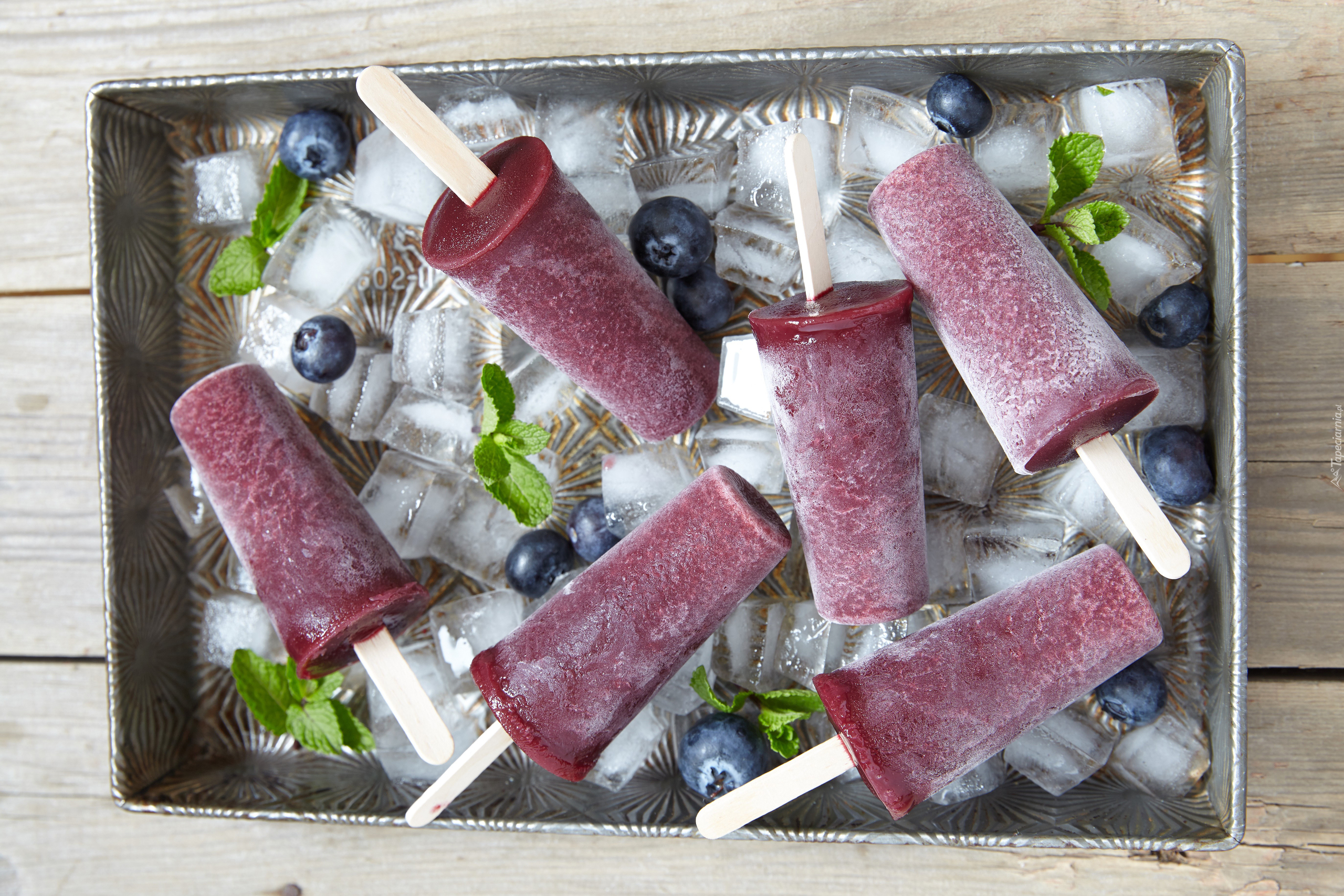 Edytor tapety: Lody na patyku i jagody na kostkach lodu