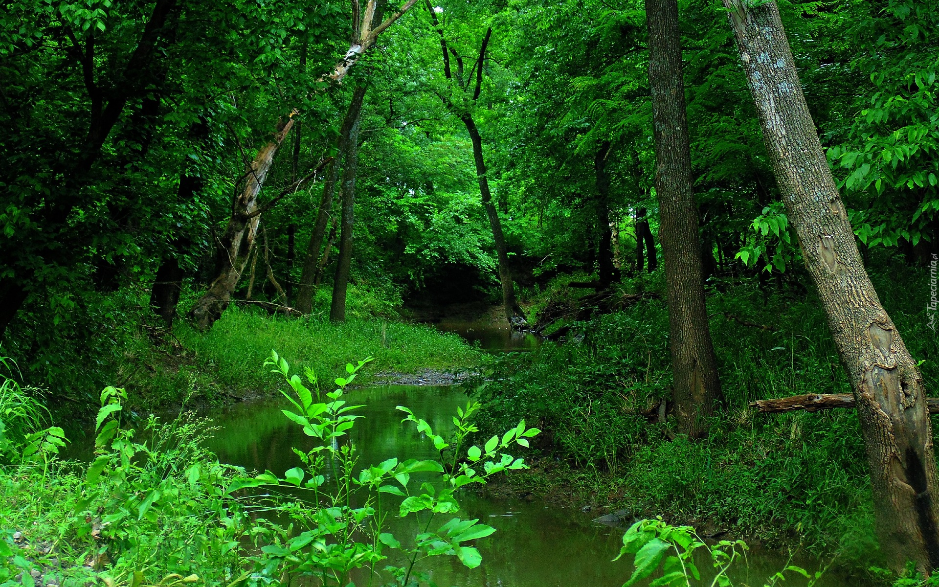 Edytor tapety: Strumień w zielonym lesie liściastym