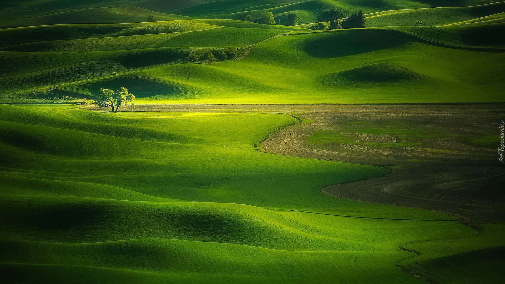 Edytor tapety: Samotne drzewo na zielonych wzgórzach Palouse