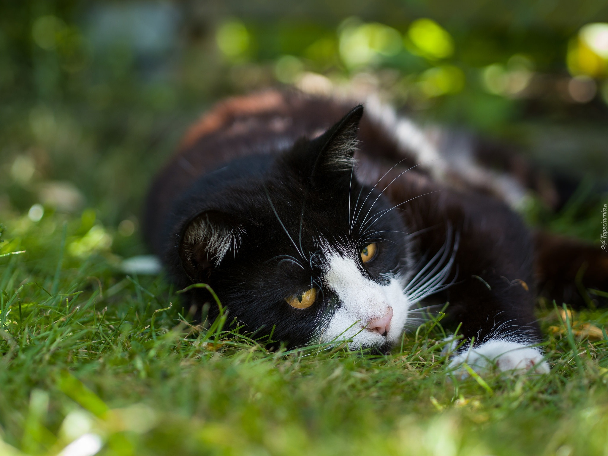 Edytor tapety: Leżący czarno-biały kot na trawie