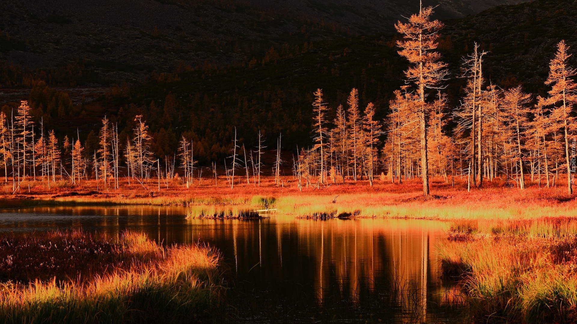 Edytor tapety: Pożółkłe drzewa i trawa nad jeziorem