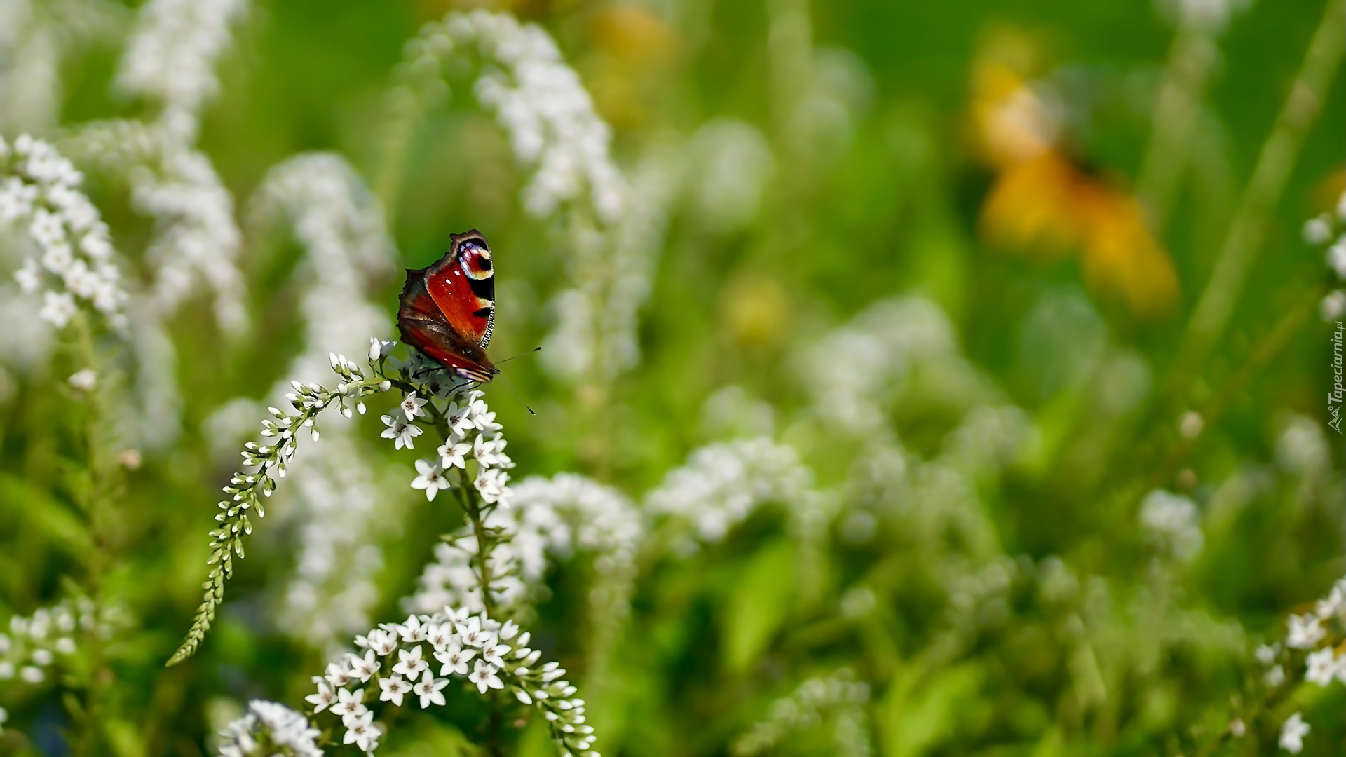Edytor tapety: Rusałka pawik na białych kwiatach tojeści